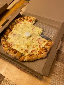 Maken hade en fantastiskt bra ide och tog hem färdig pizza från pizzerian nära jobbet och undertecknad njöt av lyxen att inte behöva koka middag ikväll.