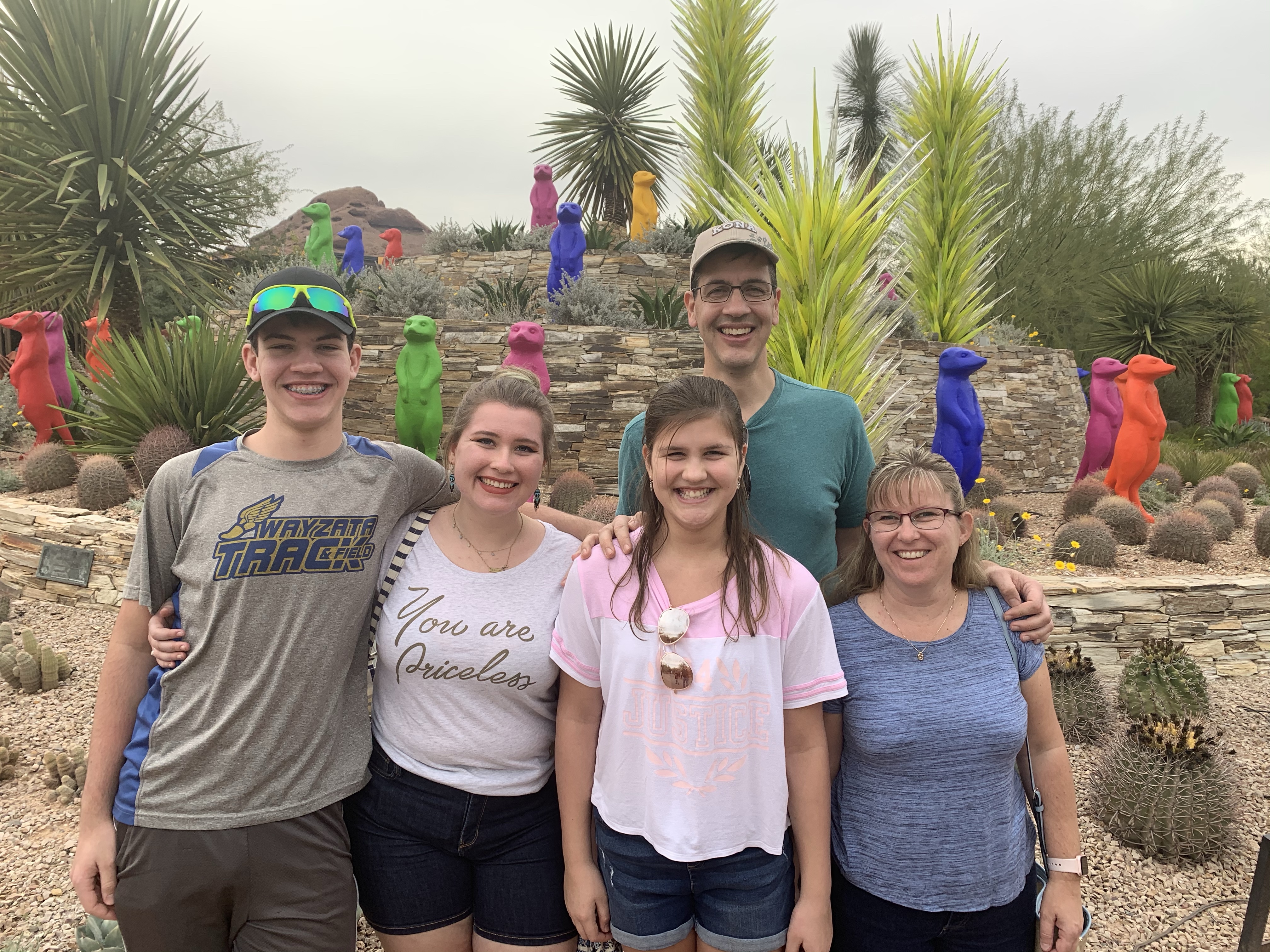 Här står då den korta mamman med den långa familjen! Bakom oss finns plastfigurer gjorda av återvunnen plast, vilket i och för sig är bra, men jag tyckte inte alls att de passade in i den vackra, naturliga ökenmiljön. De fanns kringspridda över hela parken och det fanns alla möjliga djur. Pingviner, elefanter, fåglar osv. Fiffigt påhitt kanske i en separat utställning.