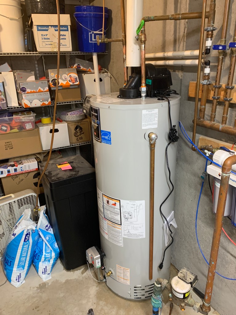 I lördags upptäckte Maken läckan. Jodå, vår nio år gamla vattenberedare som ser till att vi har varmt vatten, hade börjat läcka. Vi har väldigt hårt vatten här i Förorten där vi bor, så helt överraskade var vi inte, men ändå…. Tidpunkten för detta kunde ju ha varit lite bättre…