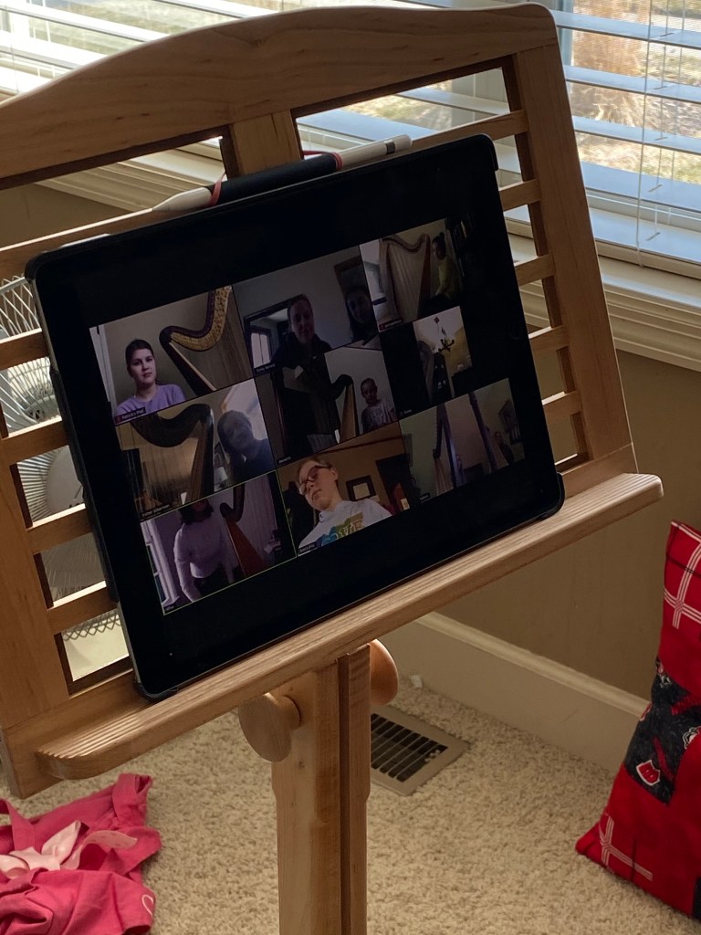 Lillasyster hade också grupplektion i harpa, precis som hon alltid har varannan fredag. Fast nu under karantän blev det träff via skärmen. Det gick förvånansvärt bra det också och nästa vecka går det säkert ännu bättre!