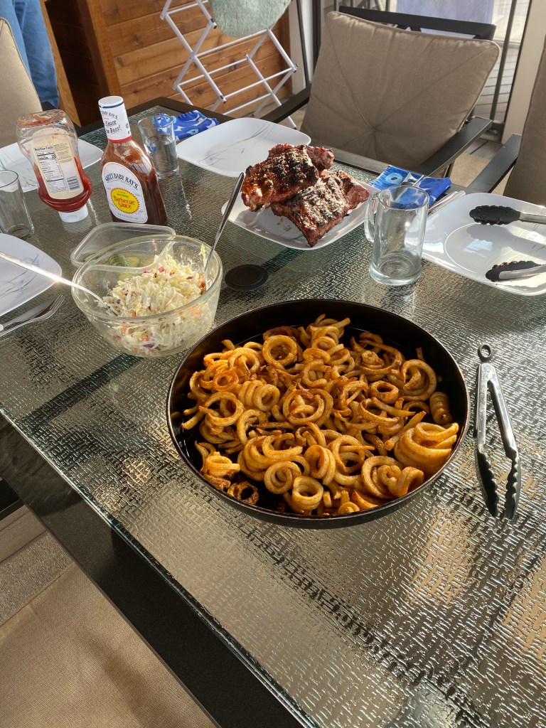 Om vi nu skall sitta hemma i karantän hela tiden, kan vi lika gärna äta gott. Alltså åkte jag till den välförsedda mataffären ( förutom wc pappret då…!) på förmiddagen och köpte revbensspjäll! Medan grillkolen värmdes upp, bakade jag kakor och Maken grillade medan jag bakade. En snabb kålsallad och kryddade franska postats till och middagen var komplett!