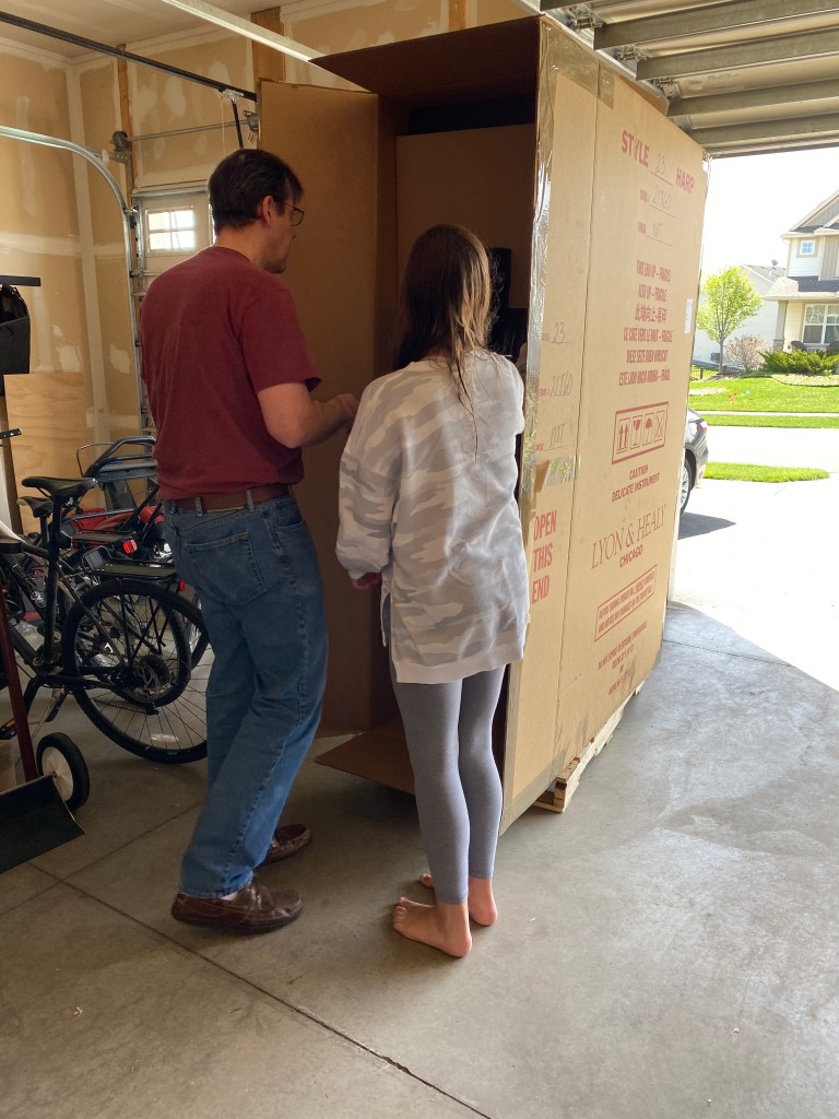 Maken och Lillasyster är numera mycket mera vana med att flytta detta instrument än vad de var då vi köpte den första harpan för nästan tre år sedan. Upp på den lilla harpkärran som är ämnad för detta ändamål och så flyttade detta nya, vackra instrument in hos oss.