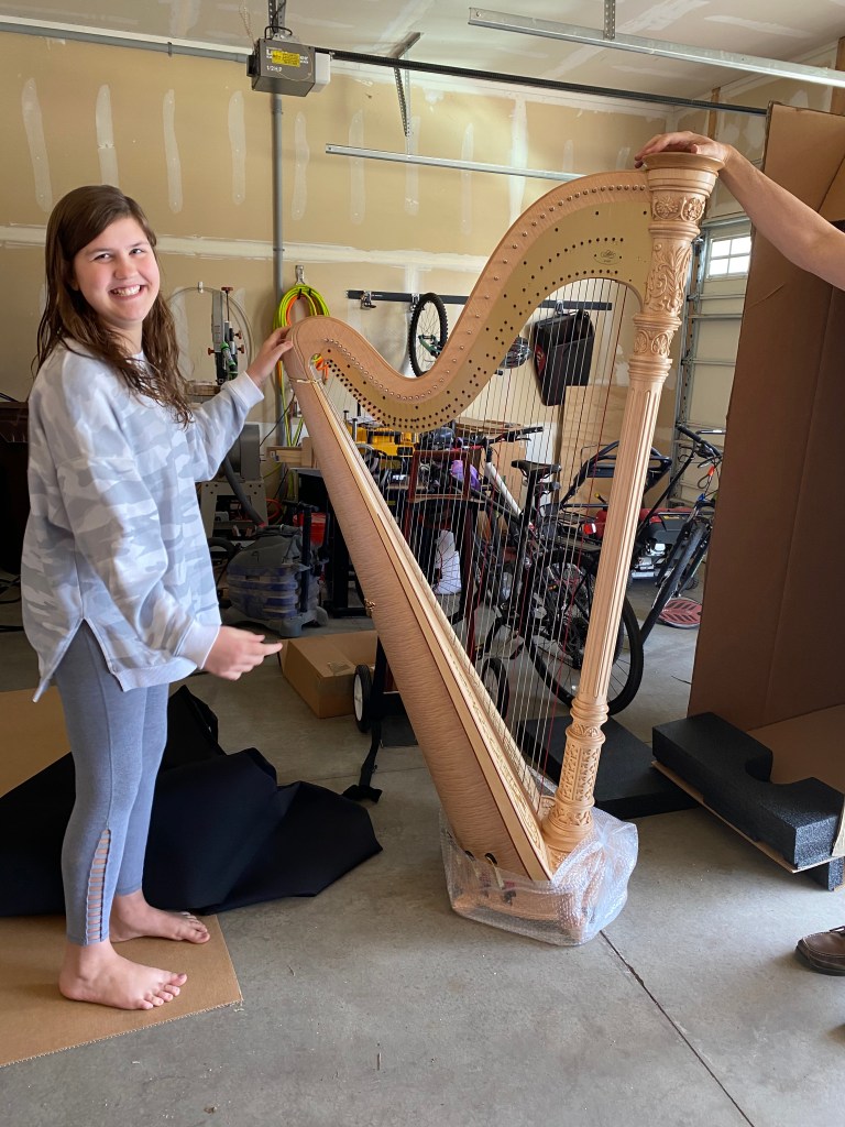 Den nya harpan, som vi beställde och köpte i oktober, var äntligen färdig och på väg hit till Förorten! Den hade utlovats till torsdagen denna vecka, men Maken fick ett telefonsamtal rätt tidigt på morgonen och chauffören undrade om vi var hemma eftersom han hade en harpa i lastbilen!
