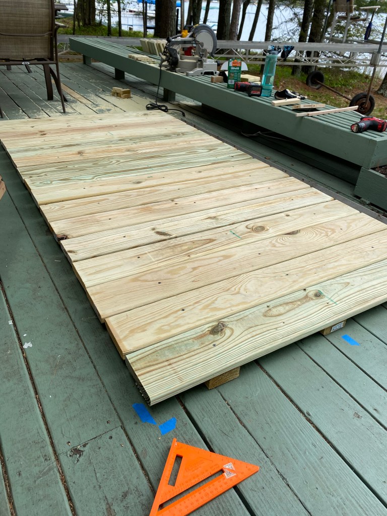 Maken fortsatte med reparation av bryggan och fick två delar till helt klara och med Dotterns hjälp fick han dem på plats.
