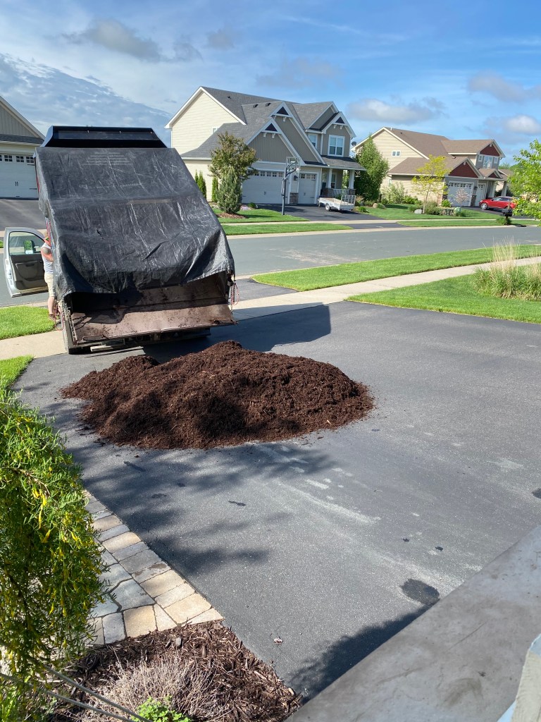 Vid tiotiden på förmiddagens kom lastbilen lastad med dagens grovarbete. En och en halv yards med träflisor och jord, som Google Translate kallar kompost då jag söker upp det, landade på uppfarten vår. Maken beställde från den lokala blomsteraffären igår och redan idag levererades det.