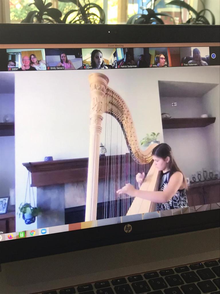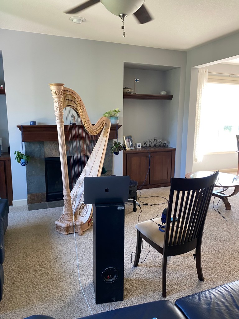 Så här såg det ut för oss här hemma strax innan konserten började. Dator, mikrofon, sladdar och harpan uppställda och klara för att förmedla denna konsert till släkt och vänner i delstaterna: Wisconsin, Arizona, Arkansas, South Carolina och Minnesota. Därtill hade Lillasyster publik i Sverige och Finland.