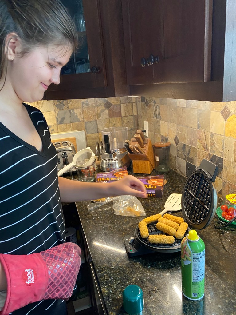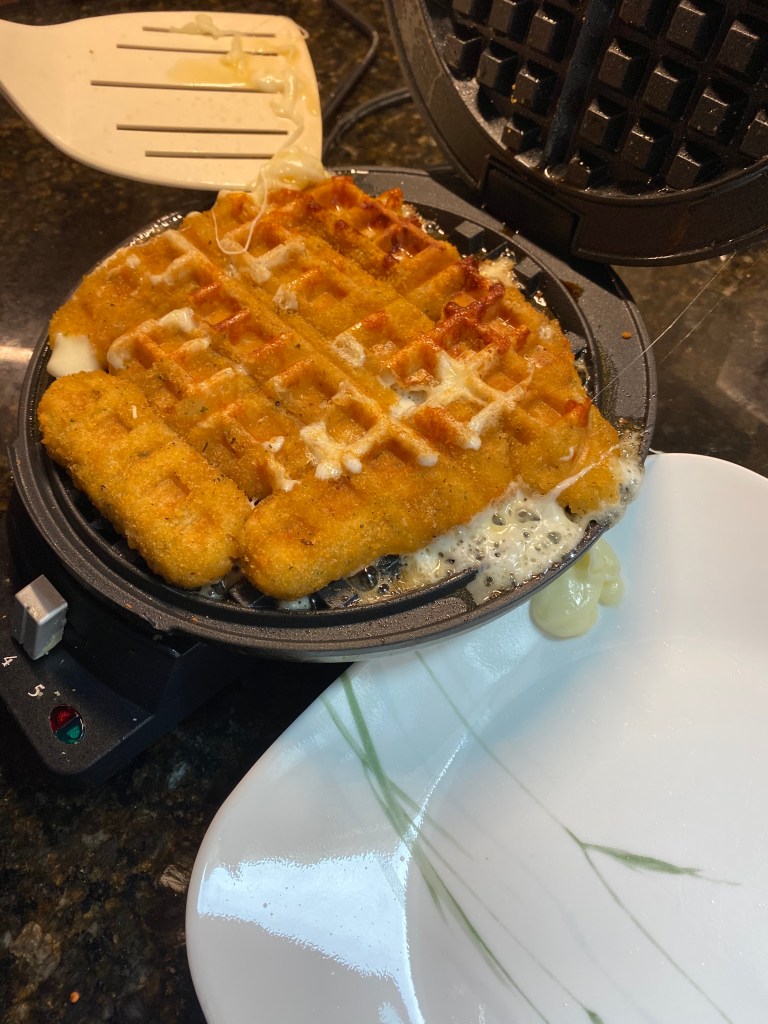 Nu när Lillasyster har egen mobil har hon förstås fått upp ögonen för Instagram och speciellt olika, enkla recept som hon hittar där. Senaste gång jag åkte till mataffären bad hon mig köpa färdiga, panerade ostpinnar. Frusna. Idag tog hon fram mitt våffeljärn och satte igång med att rada dessa på våffeljärnet för att göra en panerad ostvåffla!