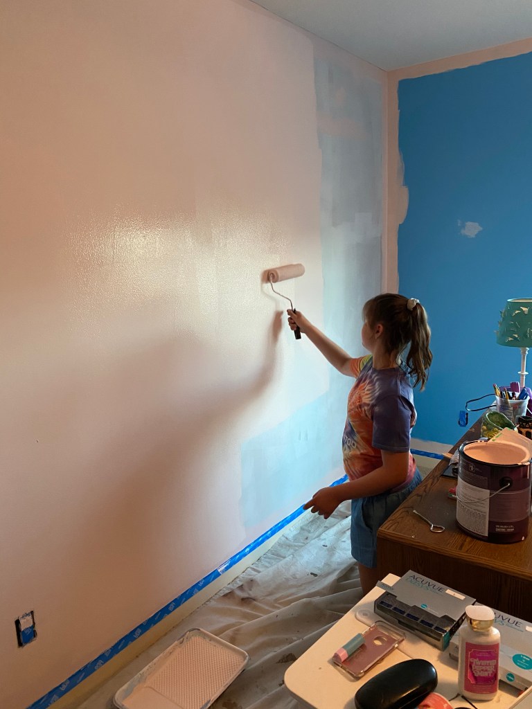 …rosa! Det har målats en del de senaste dagarna och det börjar verkligen arta sig annorlunda och väldigt snyggt. En Lillasyster som INTE skulle ha rosa väggar, valde själv färgen som hette ‘stolen kiss” och Maken handlade. Och gissa vad? Väggarna är minsann rosa!