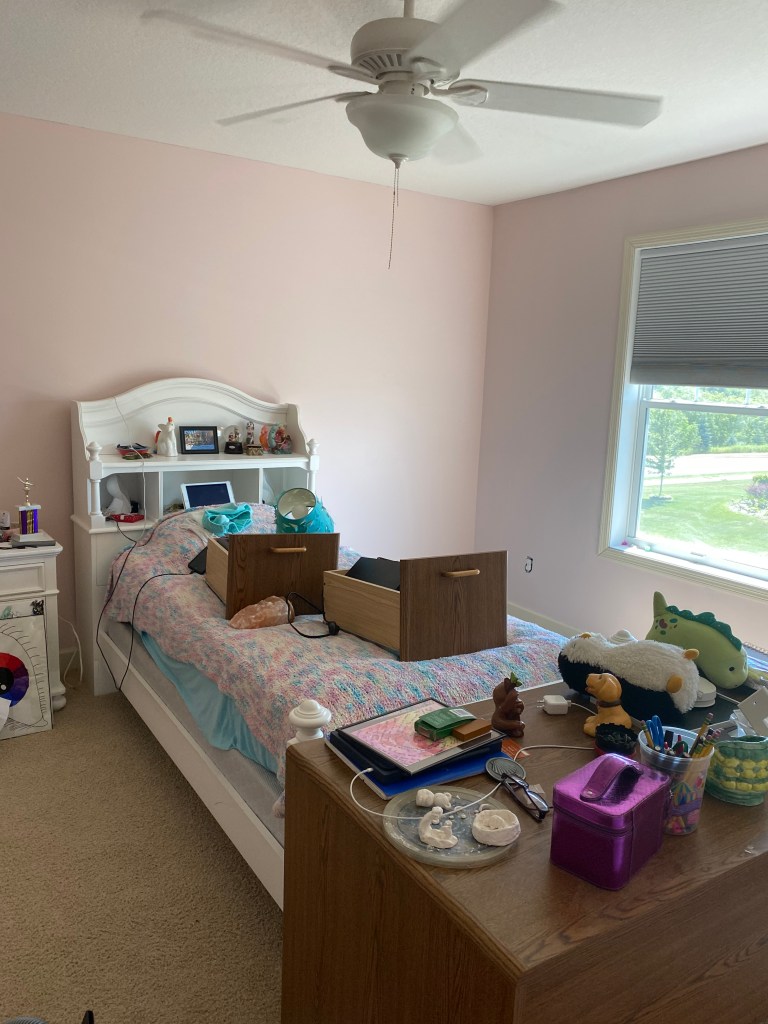 Ännu är det rörigt i hennes rum. Väggarna fick sitt andra lager färg denna eftermiddag och nu måste ju målfärgen torka innan vi kan flytta allt på plats igen. Nya möbler har vi börjat fundera på, men ännu inte beställt.