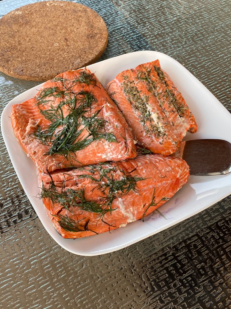 Laxen från Alaska ja….. Jag behöver väl knappast berätta att den var fantastiskt god? Lite annorlunda än den affärsköpta som vi vanligen har. Mör och mörkt röd i köttet. God i sig själv, så jag hade med flit inte lagt så mycket extra kryddor på. Enkelt serverad på tallrik med grönsaker och en god potatismos till. jag kokar numera alltid hackad vitlök i potatisvattnet med potatisen också och mosar in den mjuka vitlöken i potatisen sedan då jag gör moset. En klick smör och numera laktosfri mjölk till följd av Lillasysters besvärliga mage. Fungerar utmärkt.