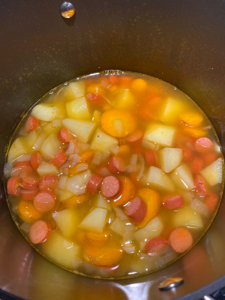 Med sådant väder är det lika bra att göra det bästa av situationen och göra en finländsk korvsoppa. Jag hade en ny slags knackkorv hemköpt som jag ville prova i soppan och det visade sig att den gav väldigt god smak till rätten. Inte lika god som knackkorven ( Snellmans knackkorv för er som är insatta!) där hemma, men den fick helt klart godkänt.