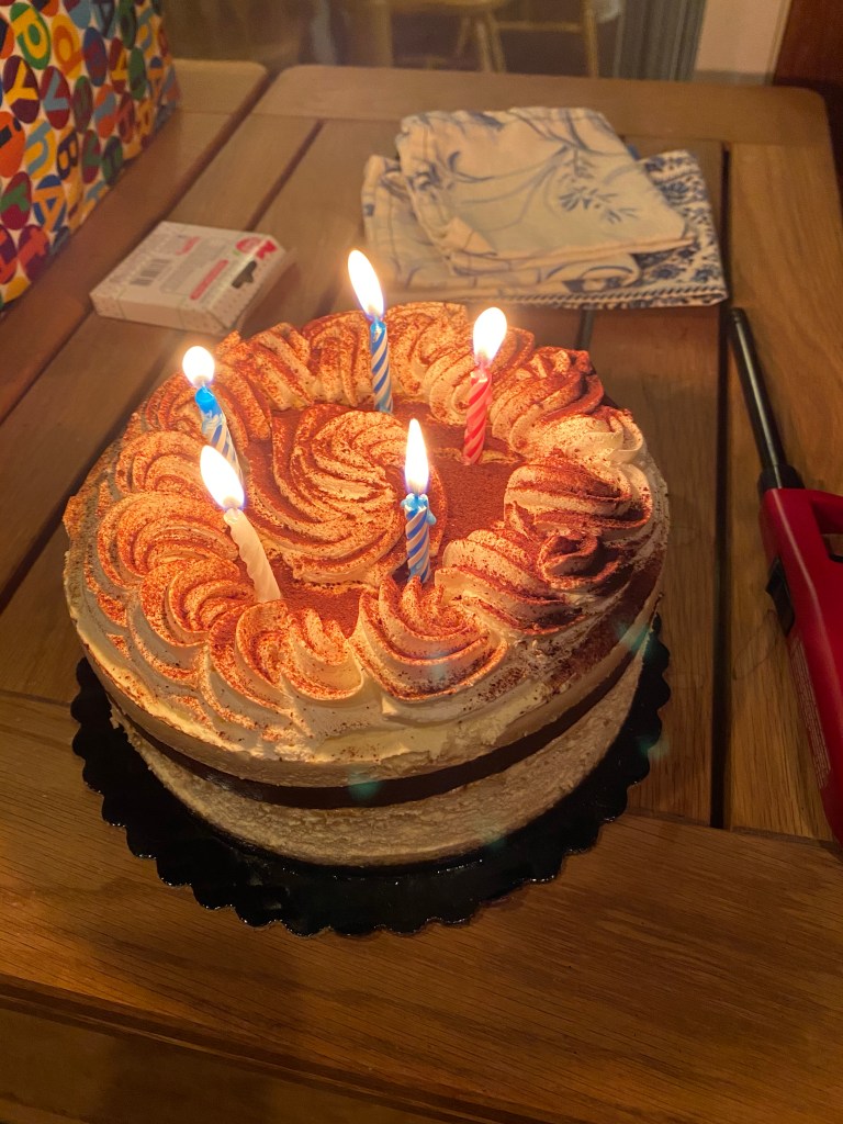 En liten tiramisu tårta blev det till efterrätt. Trots att den var så liten räckte en liten bit på var gott och väl. Grädde och socker i mängder och lite, lite smak av kaffe. Kanske inte världens bästa tiramisu. Borde nog lära mig baka denna…..