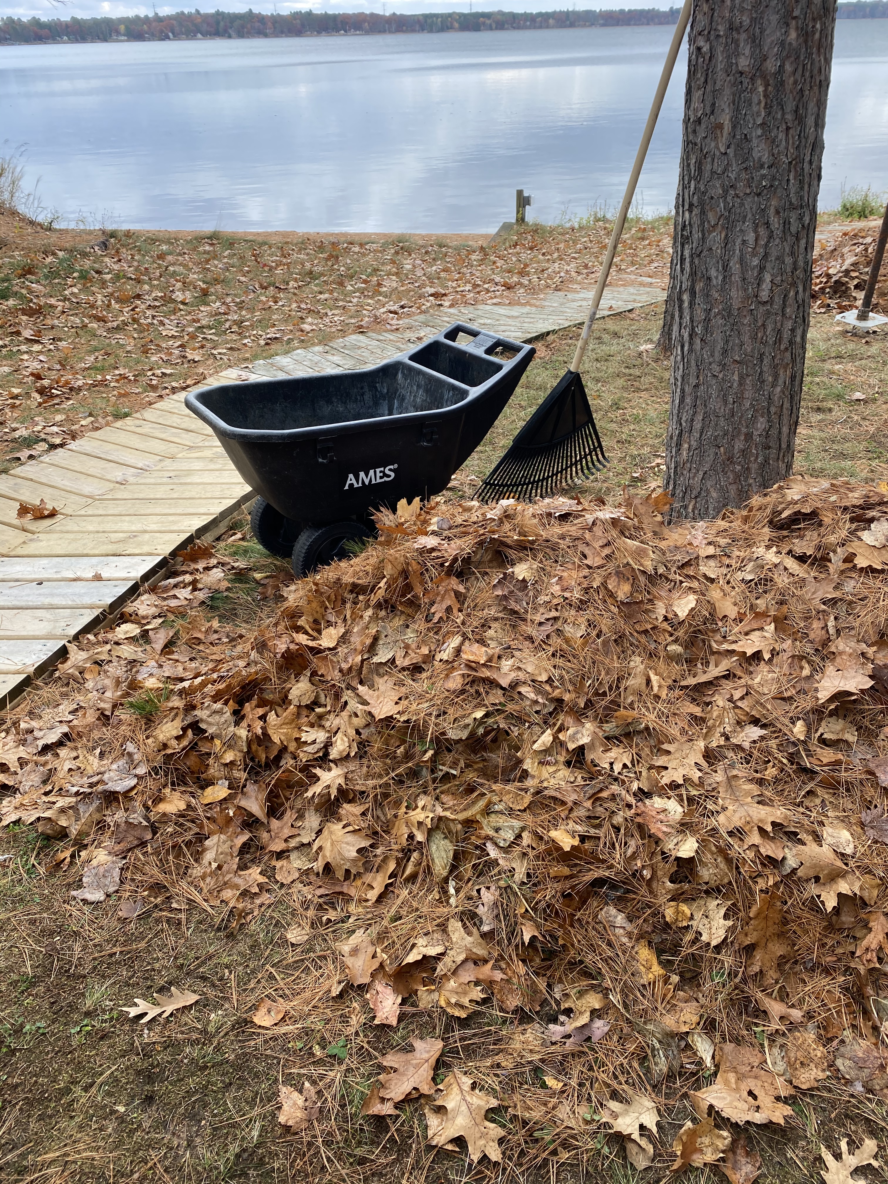 Vi vaknade till bar mark imorse, men kyligare grader. Det blev en förmiddag inne och sedan på eftermiddag kallade löven. Dags att räfsa och försöka få så mycket bort av det fallande guldet som möjligt. Vi har inte bara en hel del fallna lönnlöv och björklöv utan också massvis med fallna tallbarr som behövde räfsas upp.