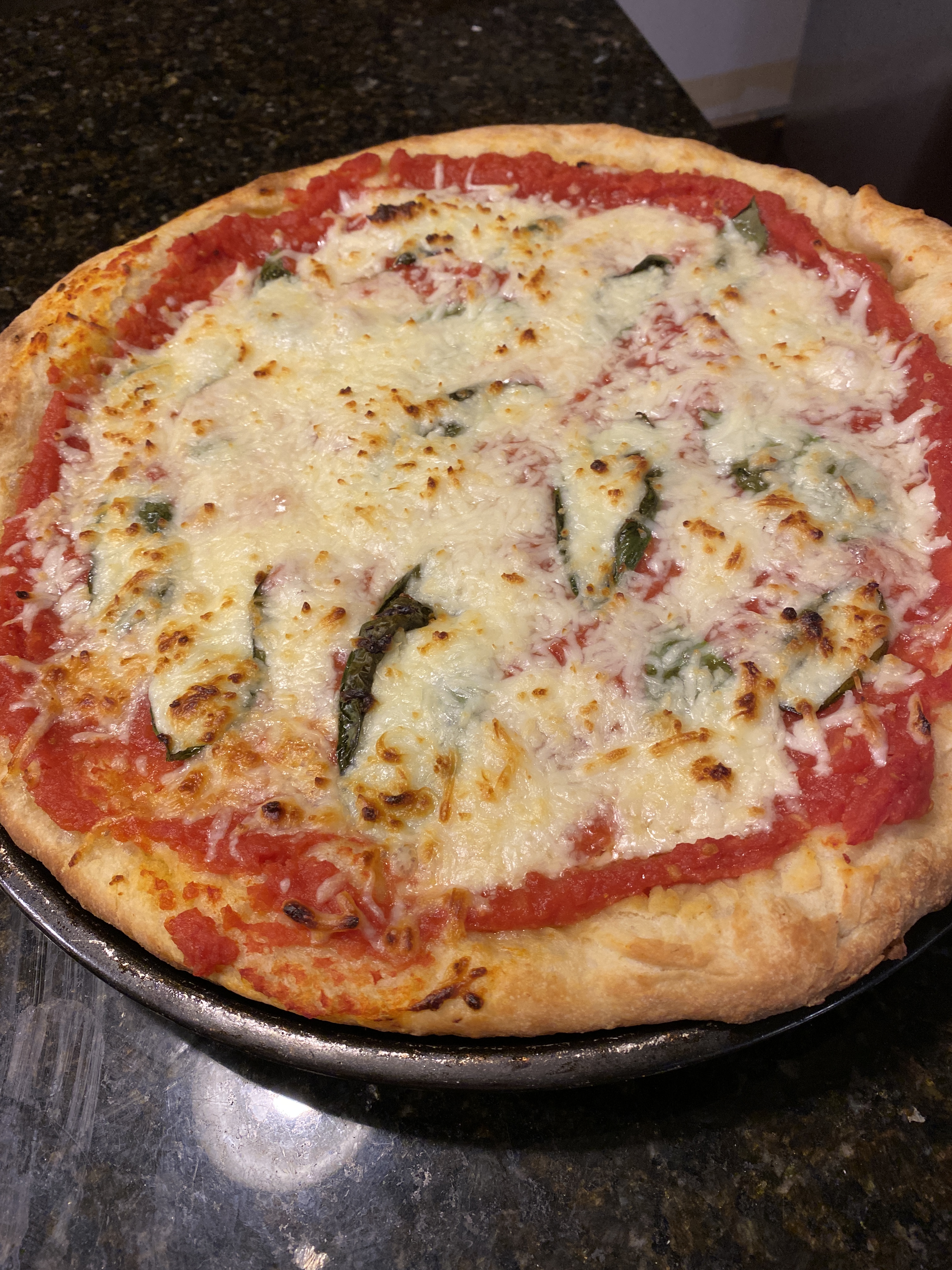 Jag måste säga att jag blev väldigt nöjd med pizzorna efter att de båda kom ur ugnen. Pizzan ovan hade jag satt krossade tomater, färska basilika löv och mozzarella ost på. En vitlöksklyfta fanns också nedhackad i den krossade tomaten, samt lite salt och en gnutta socker. Socker har ju som bekant den förmågan att ta fram smaken i tomaterna ännu mera, så naturligtvis lade jag i lite.