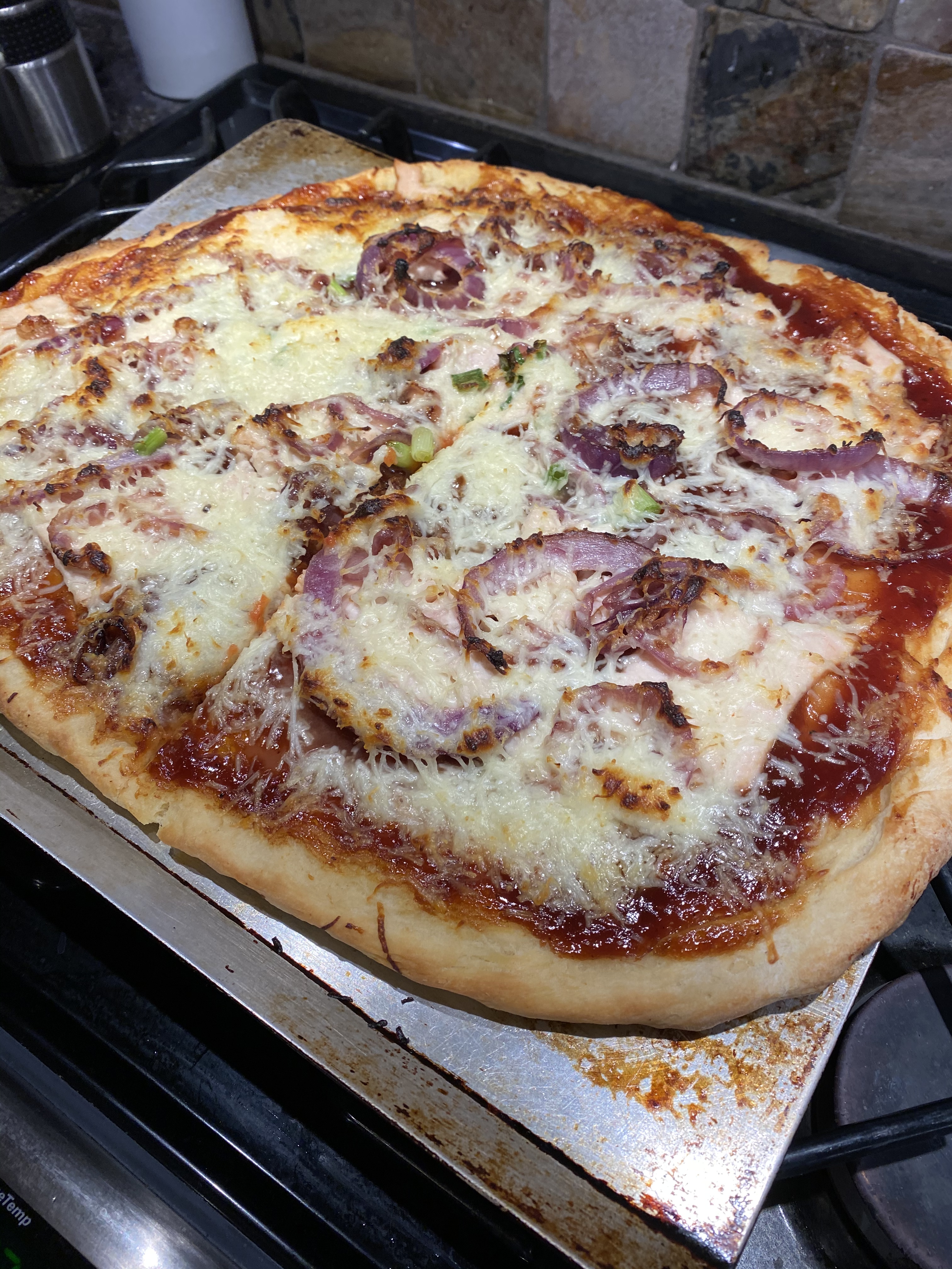 Pizzan ovan var Sonens favorit. Med grillsås istället för tomater, kyckling, stekt lök, salladslök och en ordentlig dos med mozzarella. Tidskrävande med egna pizzor, visserligen, men ändå så mycket bättre än hämtpizza!