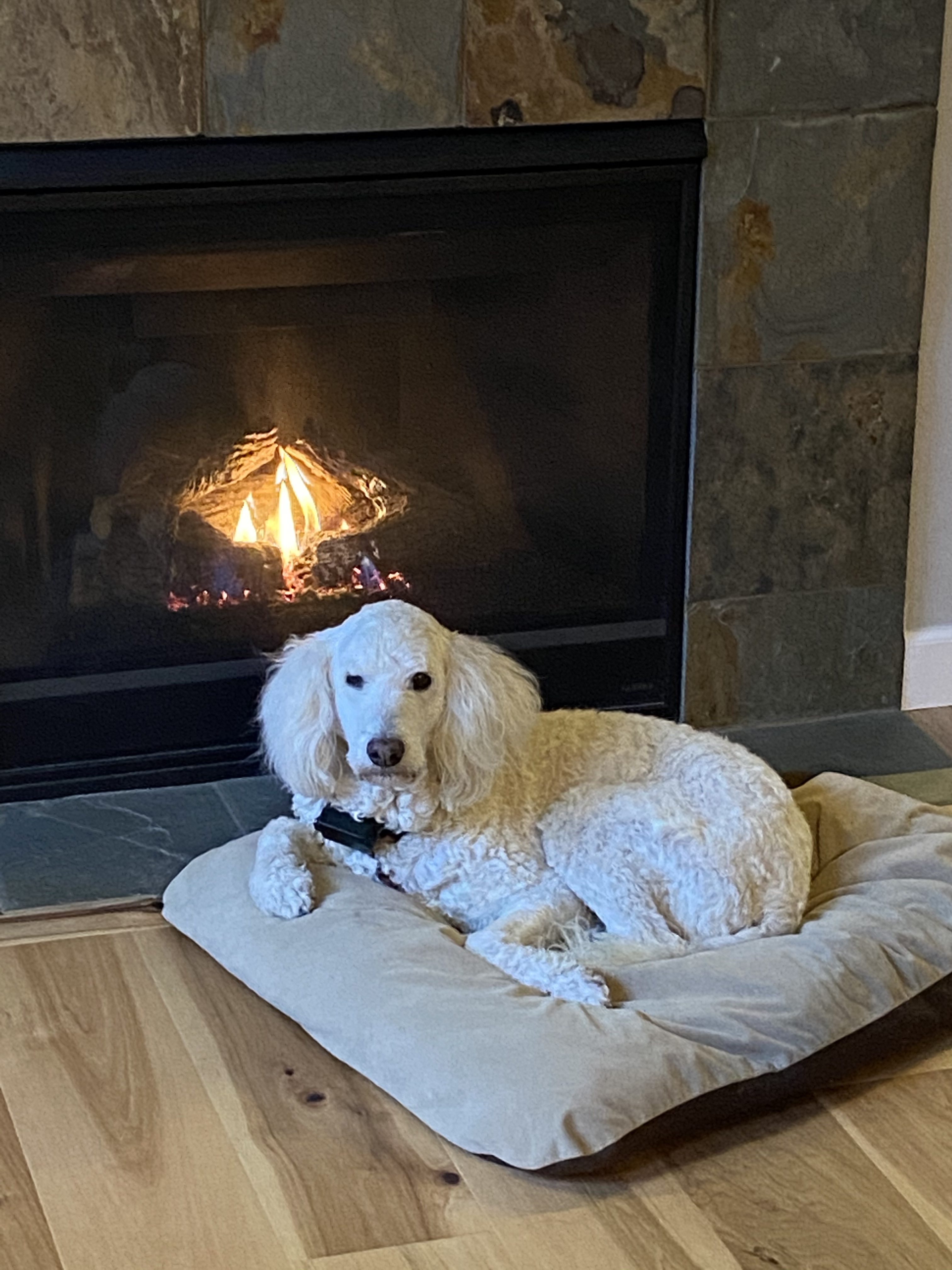 Lilly är hemma igen efter sin utfärd med Maken till sommarstugan, men vet ni vad? Hon gillar INTE det nya parkettgolvet! Det är hårt, halt att springa på och inte alls skönt att ligga på. Matte beslöt att lägga hennes gamla, utnötta kudde framför spisen tidigare idag på eftermiddagen och detta gillades. När Lillasyster sedan slog på gasen till den öppna spisen kunde ju Lilly verkligen inte flytta på sig. Det var ju så varmt och skönt!