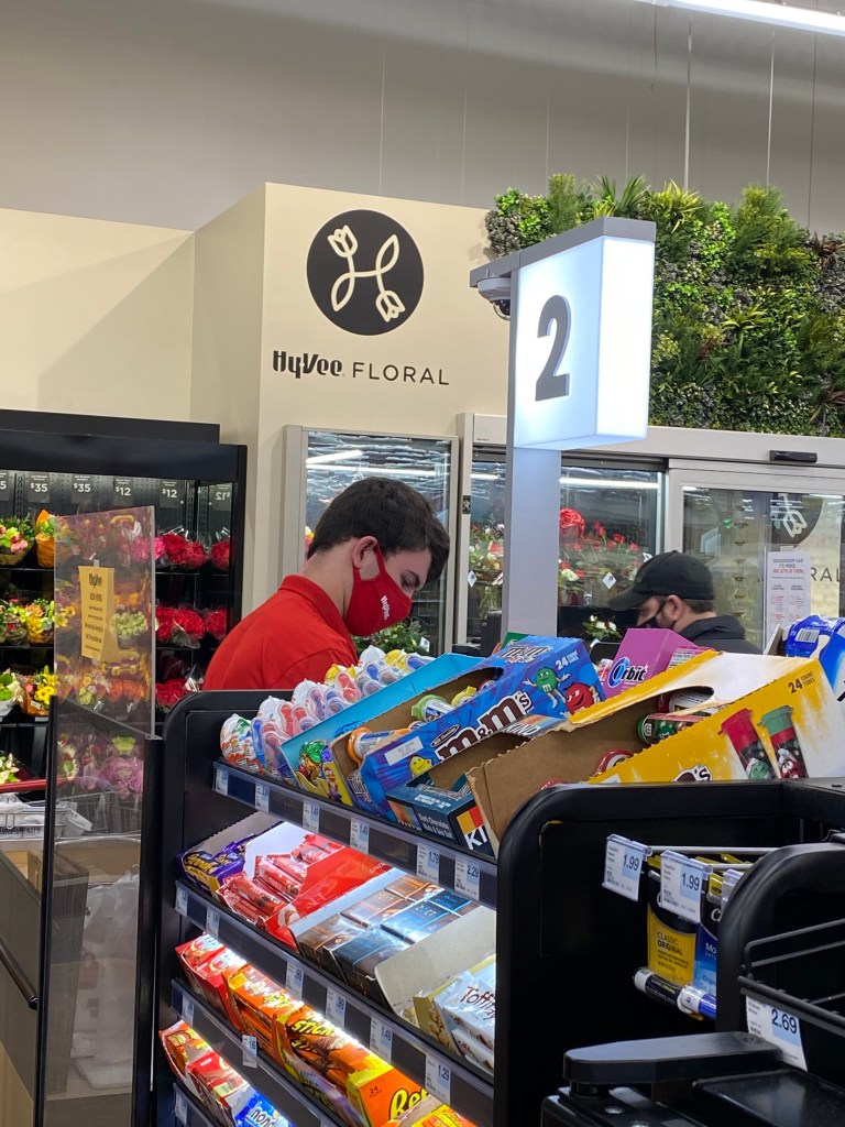 Här är han i kassan. Bilden tagen medan jag och Lillasyster besökte mataffären tidigare på eftermiddagen. Sonen jobbar vanligen både lördagar och söndagar. Han är egentligen anställd i mjölkavdeliningen. Beroende på var anställda behövs, är han ändå lite överallt i mataffären.