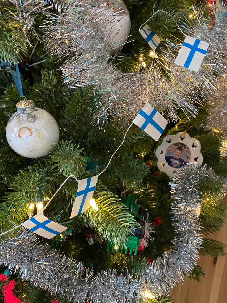 Granen pryds också varje år med flaggor, så även i år. Dock inga ‘Stars and Stripes’ vilket kanske är lite märkvärdigt. Vi borde ju nog egentligen ha båda flaggorna representerade i granen….