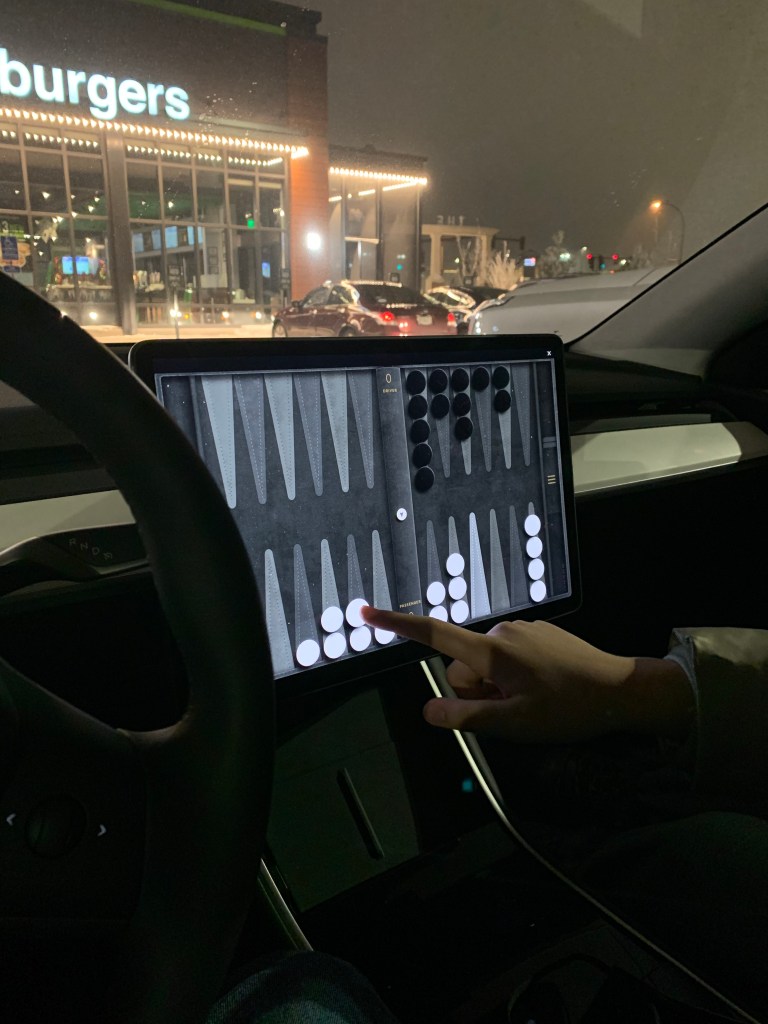 Medan de väntade satt de i Teslan och spelade spel på den stora skärmen som bilen kommer med! Väldigt behändigt tidsfördriv. Maten blev färdig så pass snabbt att de inte hann njuta av brasan som man också kan ställa in skärmen. En annan gång kanske…😂