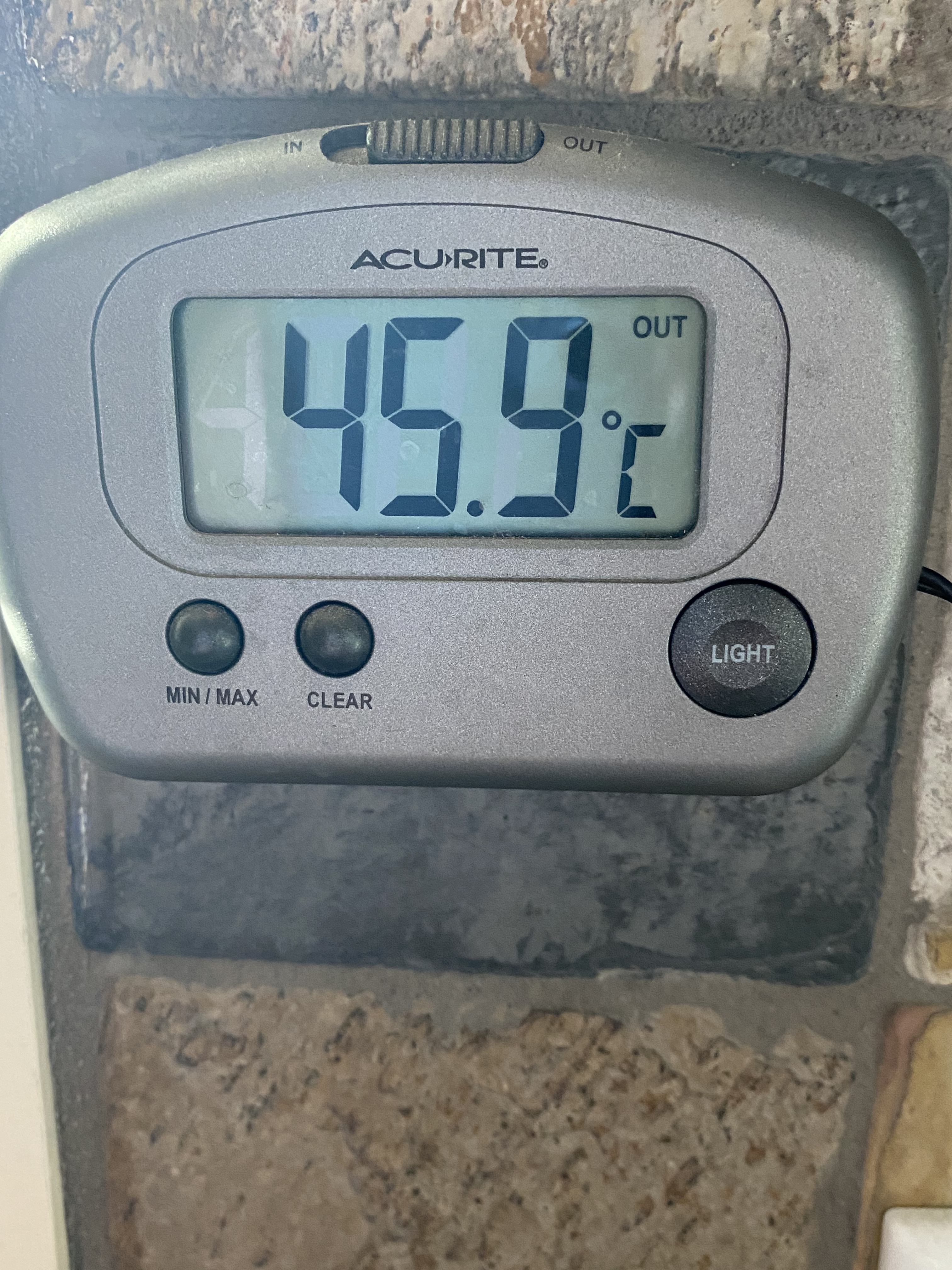 Nej, det var INTE 46 grader ute. Åtminstone inte i skuggan. När jag tog bilden ovan ikväll vid 19 tiden, var sensorn för denna termometer i solen och nära väggen. I skuggan var det en betydligt svalare 36 grader….