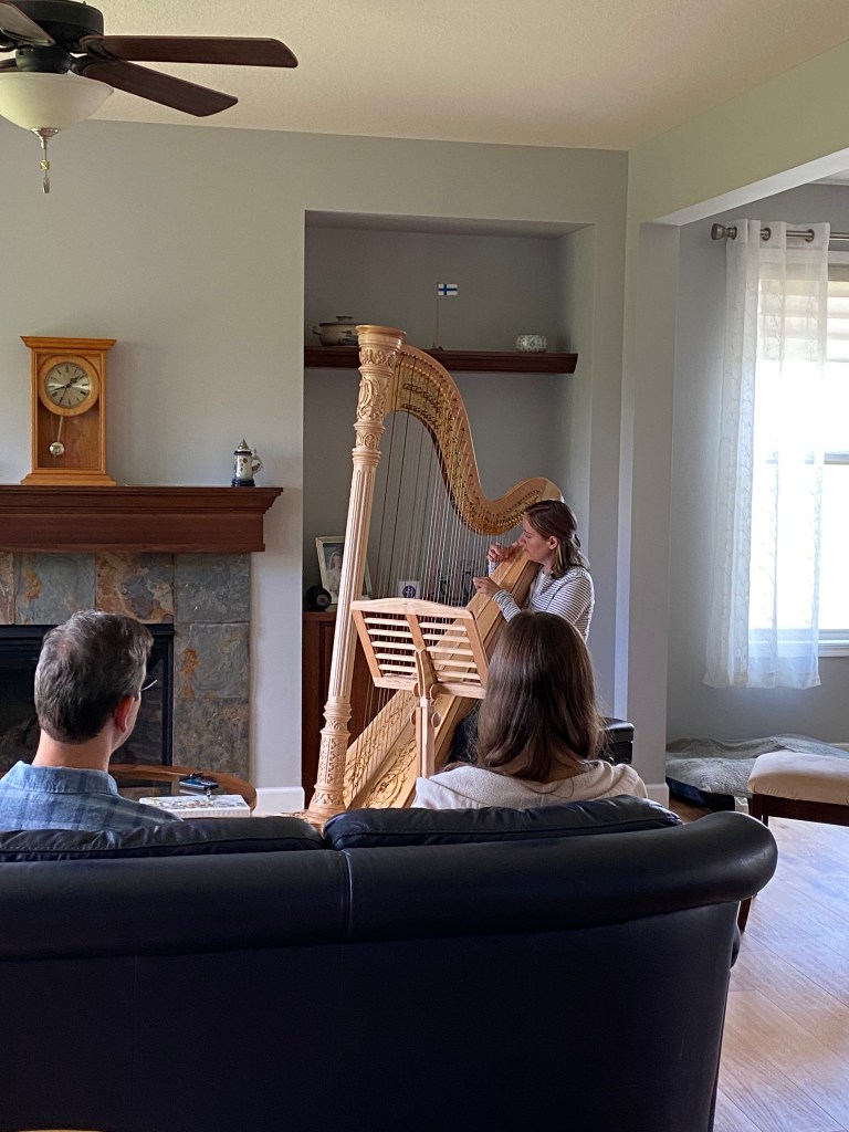 Eftermiddagen har ägnats åt bland annat tvättberget och nu lär det mesta klart. Lillasyster har haft lektion i harpa här hemma med besökande instruktör och har äntligen fått visa upp sin nya harpa. Den har hon ju redan haft i ett år, men har, förstås pga pandemin inte fåt visa upp, annat än på skärmen, åt sin instruktör.