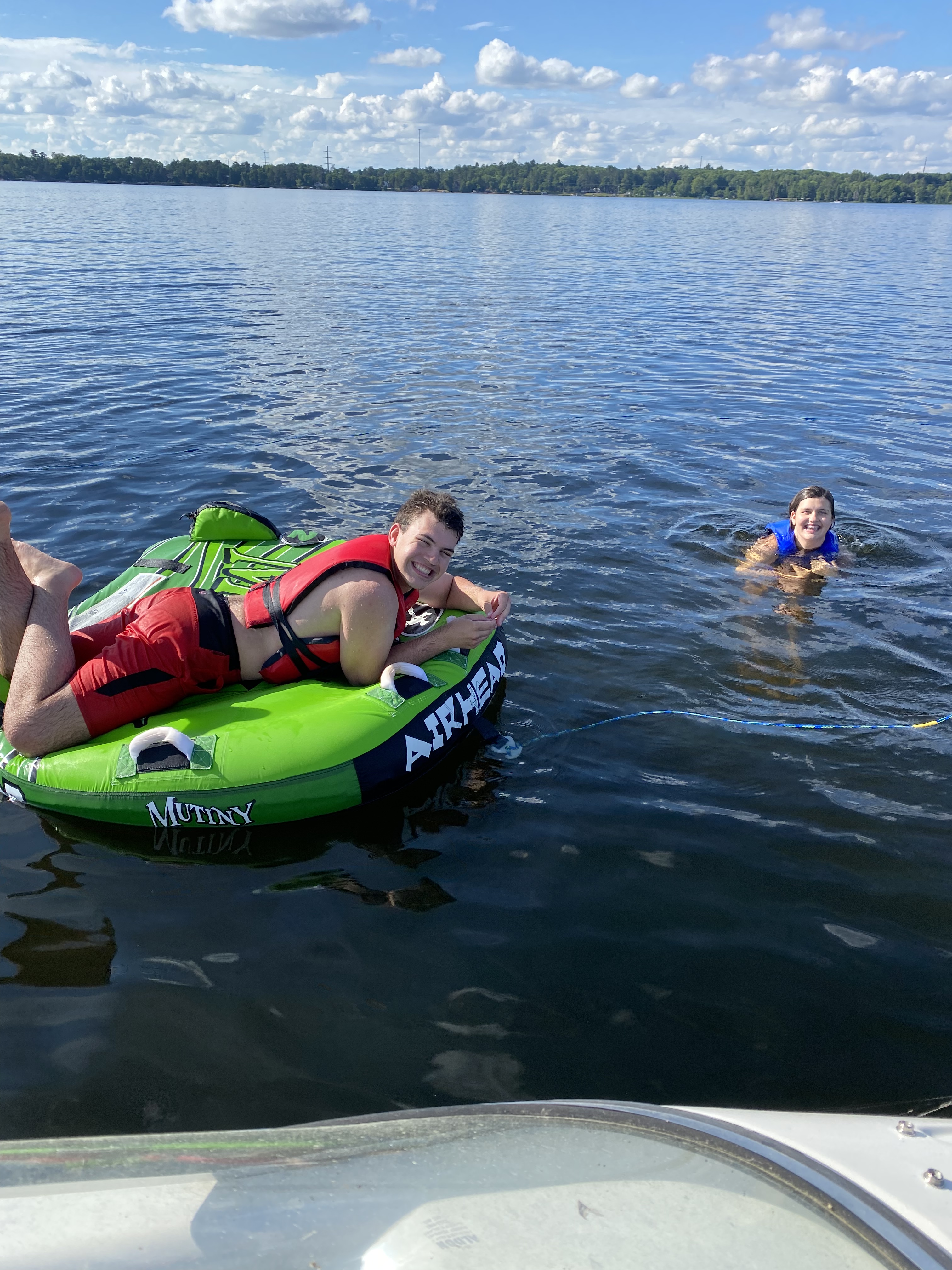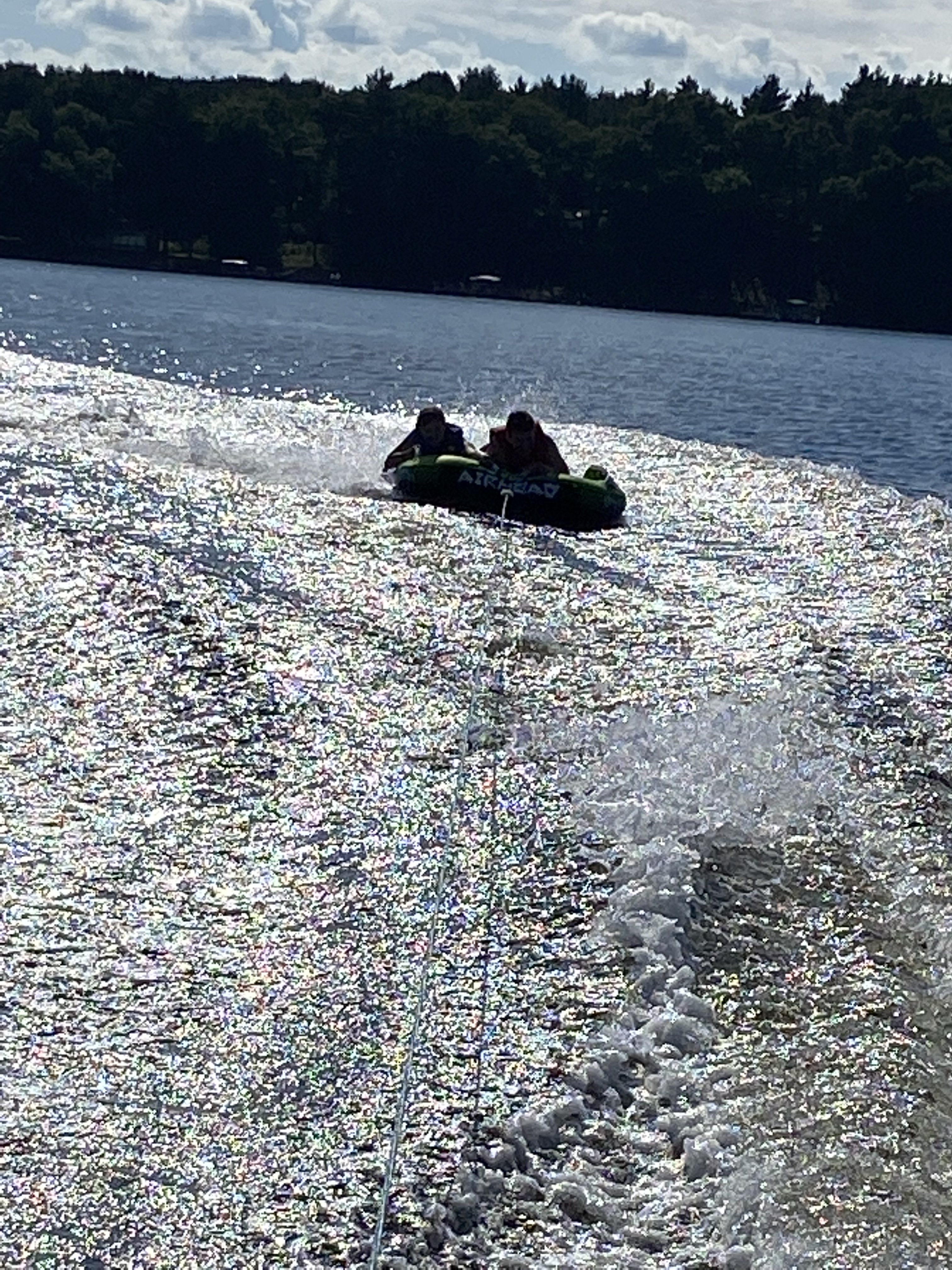 Efter dryga timmen var alla klara och vi styrde åter mot land. Nu var det dags att åka på luftmadrass eller det som kallas ‘tubing’ på engelska och är väldigt populärt bland barn och ungdomar. Vi åkte alltså in till land och hämtade denna luftmadrass som är specialtillverkad ( i Kina ) för detta ändamål. Sedan styrde vi kosan ut på sjön igen. Samma regel gäller här. Ngn i båten måste sitta baklänges för att hålla ett öga på ungdomarna i vattnet. Bara för undertecknad att åter bänka sig medan Maken rattade båten.