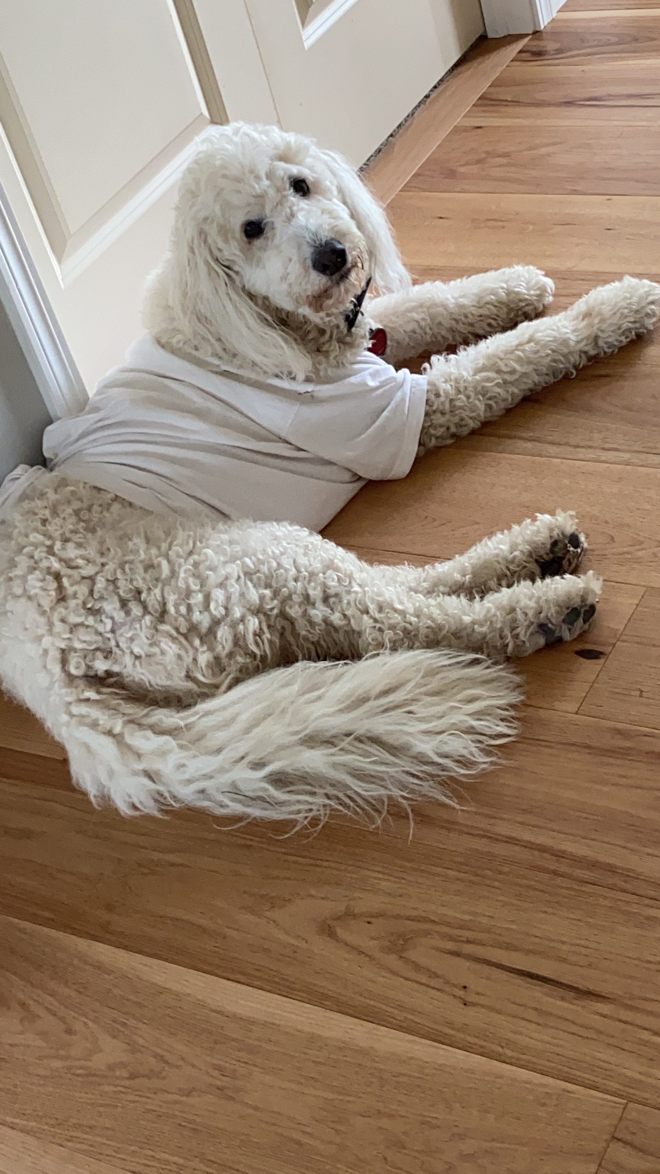 Lilly fortsättningsvis klädd i t skjorta. Såren under läker fint och jag duschar henne varje förmiddag. Hon är inte särkilt förtjust i detta duschande, men med lite extra hund godis kommer hon snällt in i duschen och står där de där tålmodigt de tio minuterna som det rekommenderas på schampo flaskan.. Är man äldre hund tant så är man och får stå ut med lite ett och annat. Det där med t skjorta var en helt ypperlig ide, för hon lämnar såren ifred samtidigt som hon inte verkar störas det minsta med att gå med kläder på. Duktig vovve är hon!