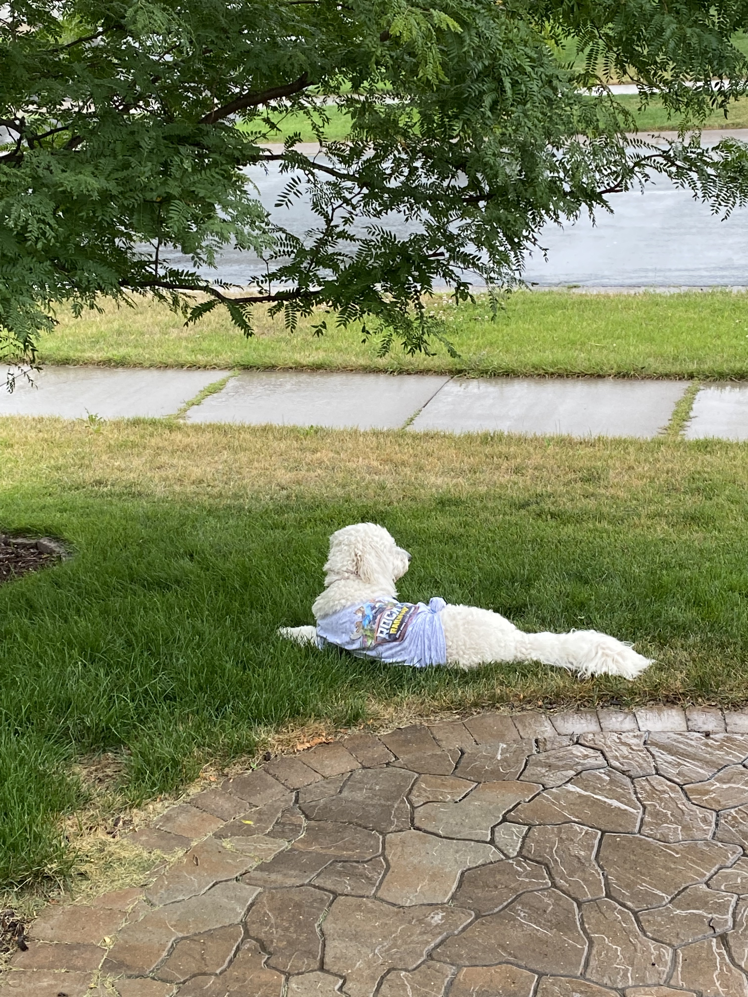 Lilly, fortfarande iklädd t skjorta brydde sig inte det minsta om det våta som spillde ner ur skyarna. Lade sig bekvämt under korstörnen på framsidan av vårt hem och bara trivdes. Ville inte alls komma in då matte ropade på henne och steg motvilligt upp från sin bekväma, gröna viloplats med vy över hennes gata.