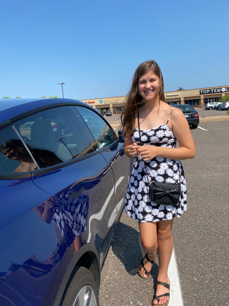 En glad Lillasyster på väg in i bilen under eftermiddagens shoppingrunda