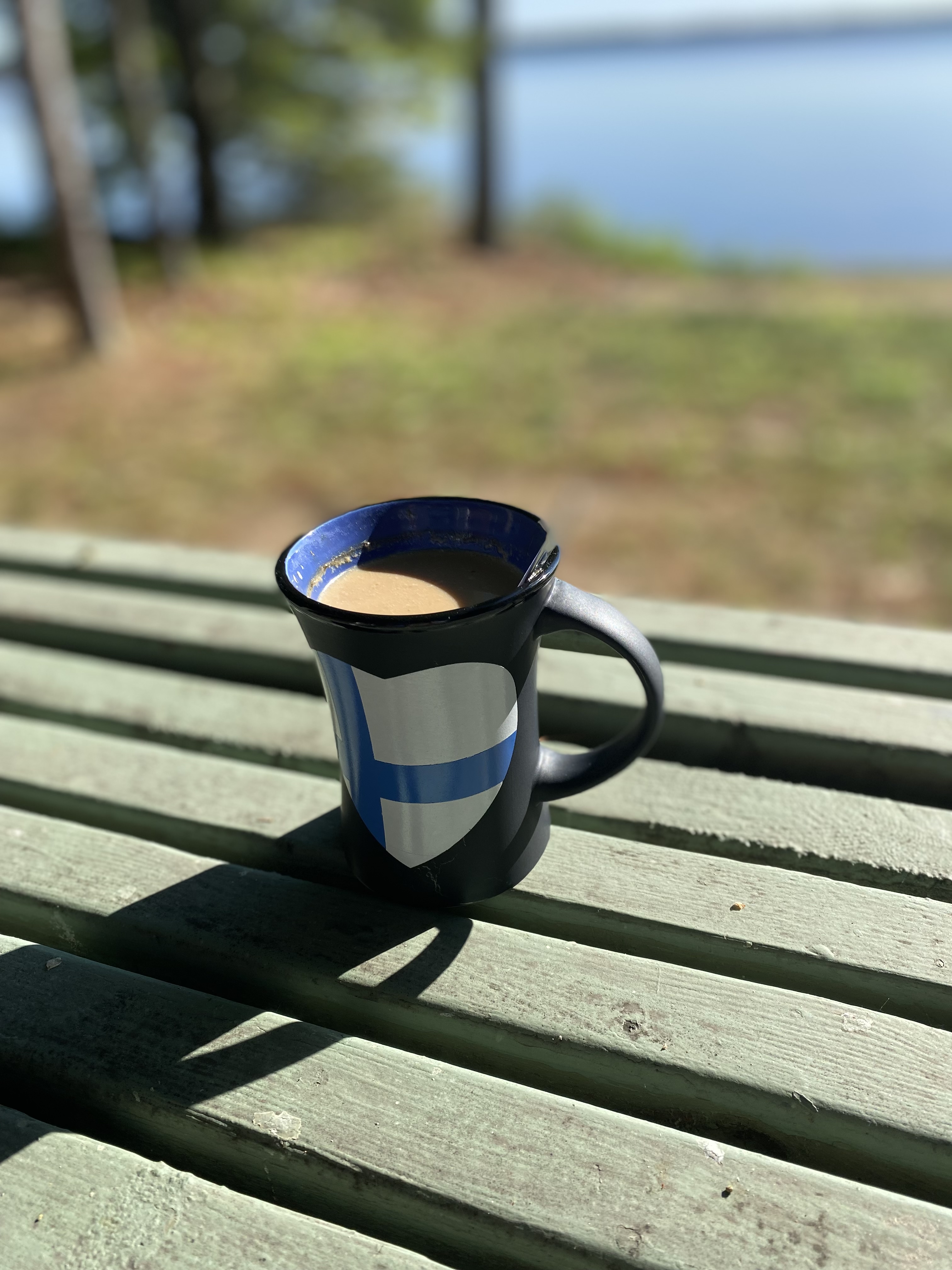 Jo men visst. Frukosten utomhus med utsikt över en alldeles spegelblank sjö….