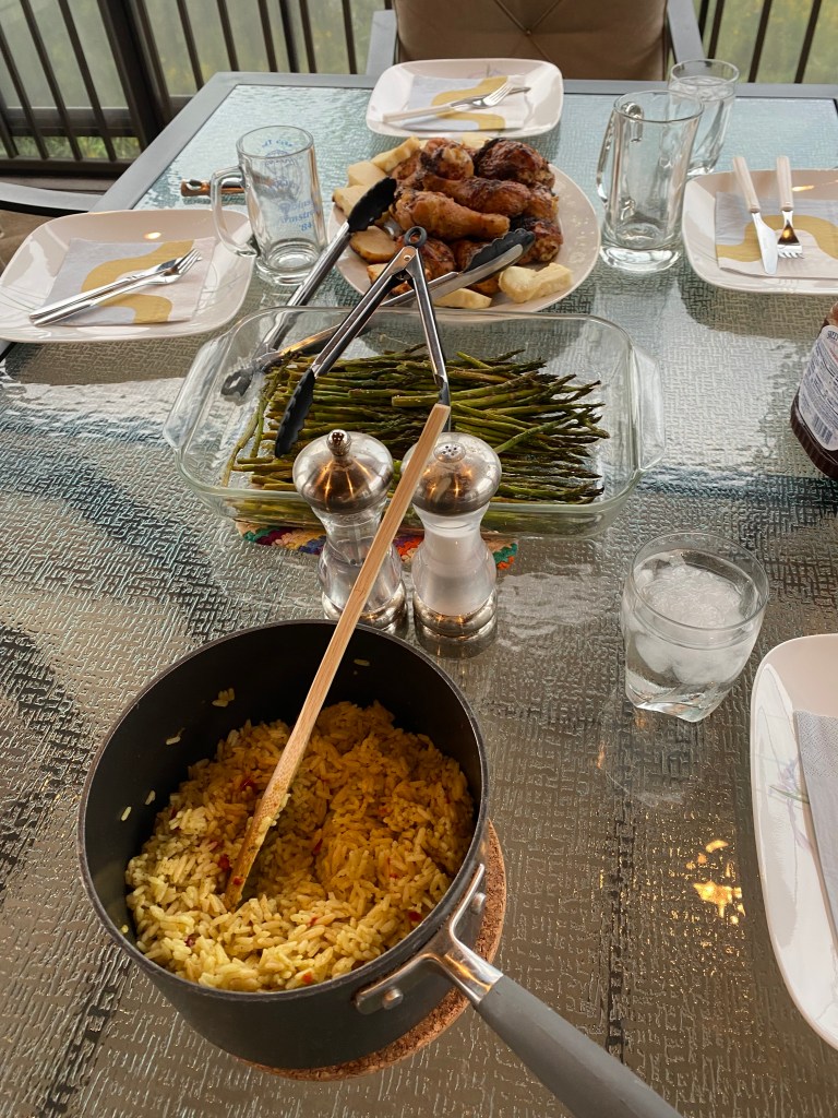 Ris, ugnsstekt sparris med olivolja och kryddor, den grillade kycklingen och osten.