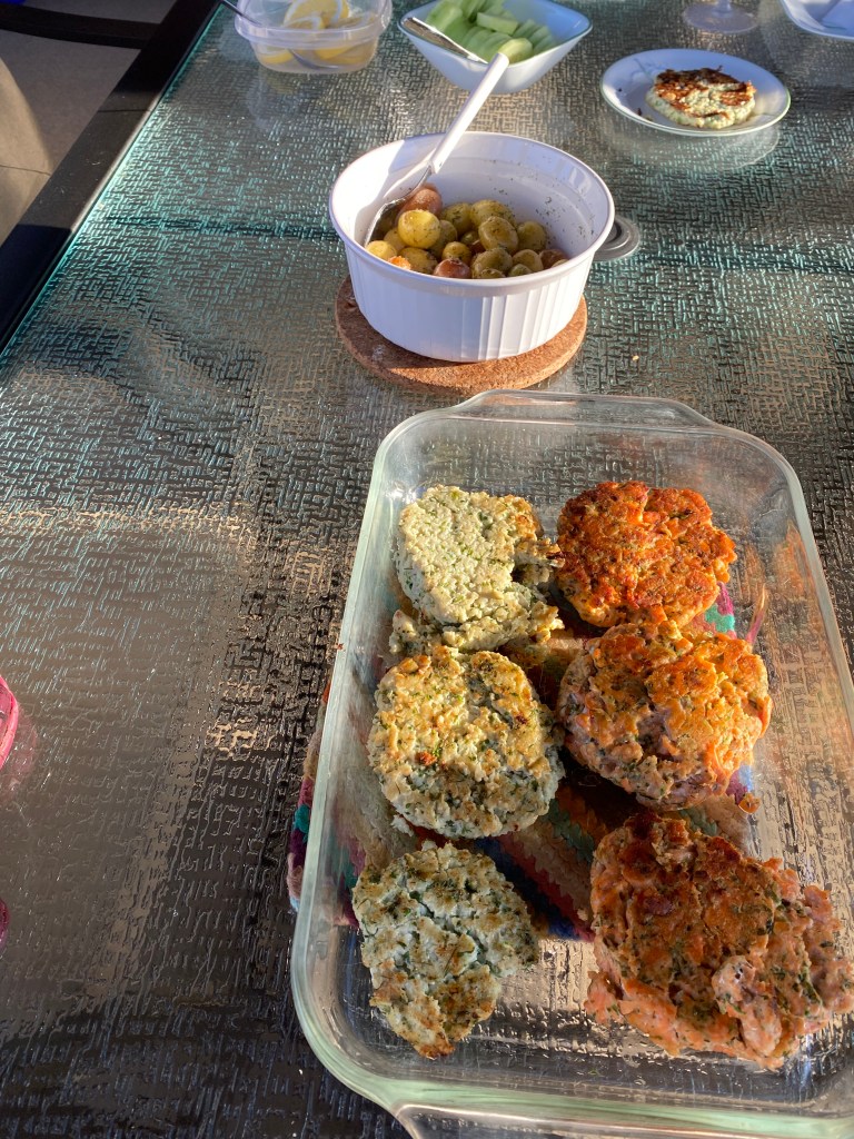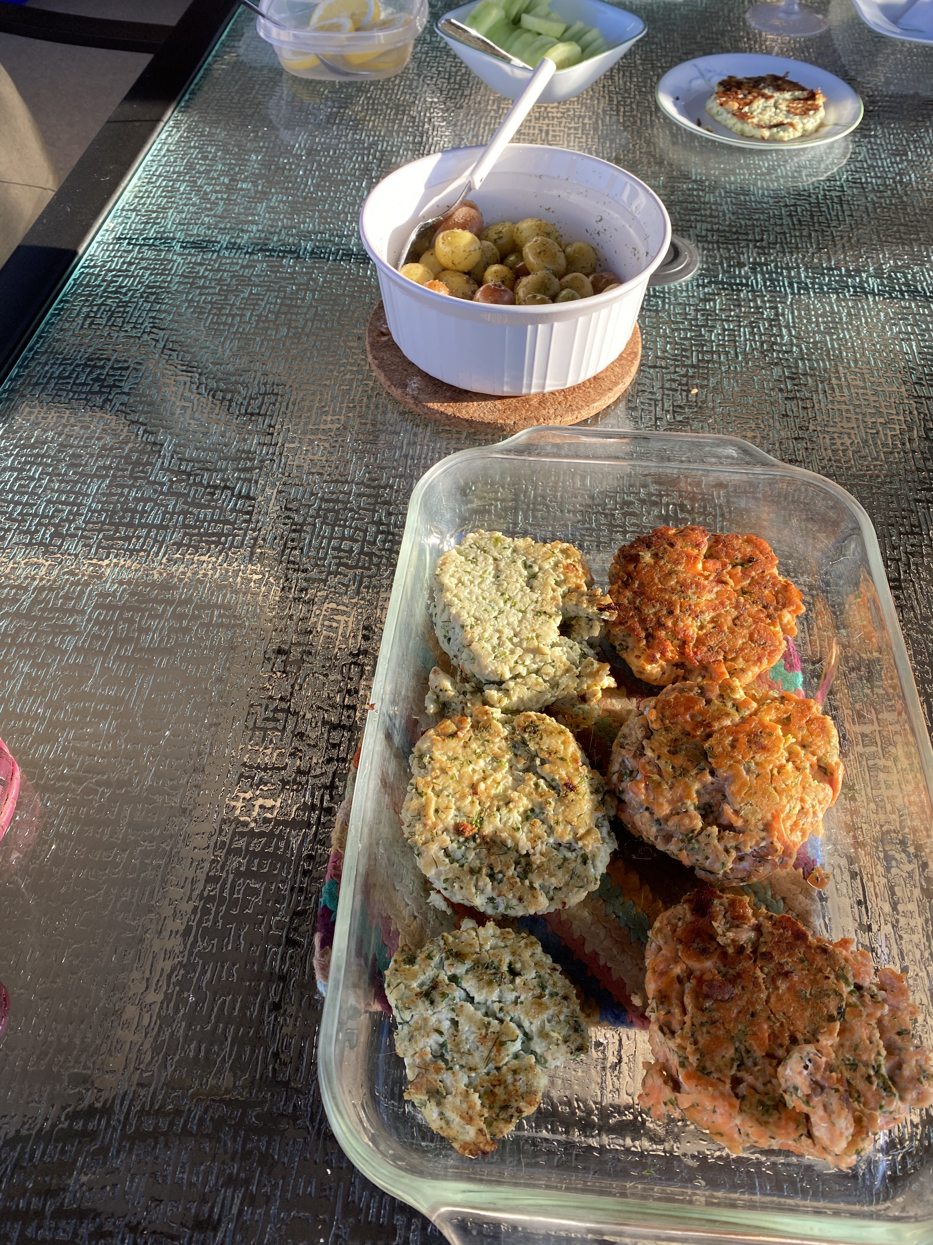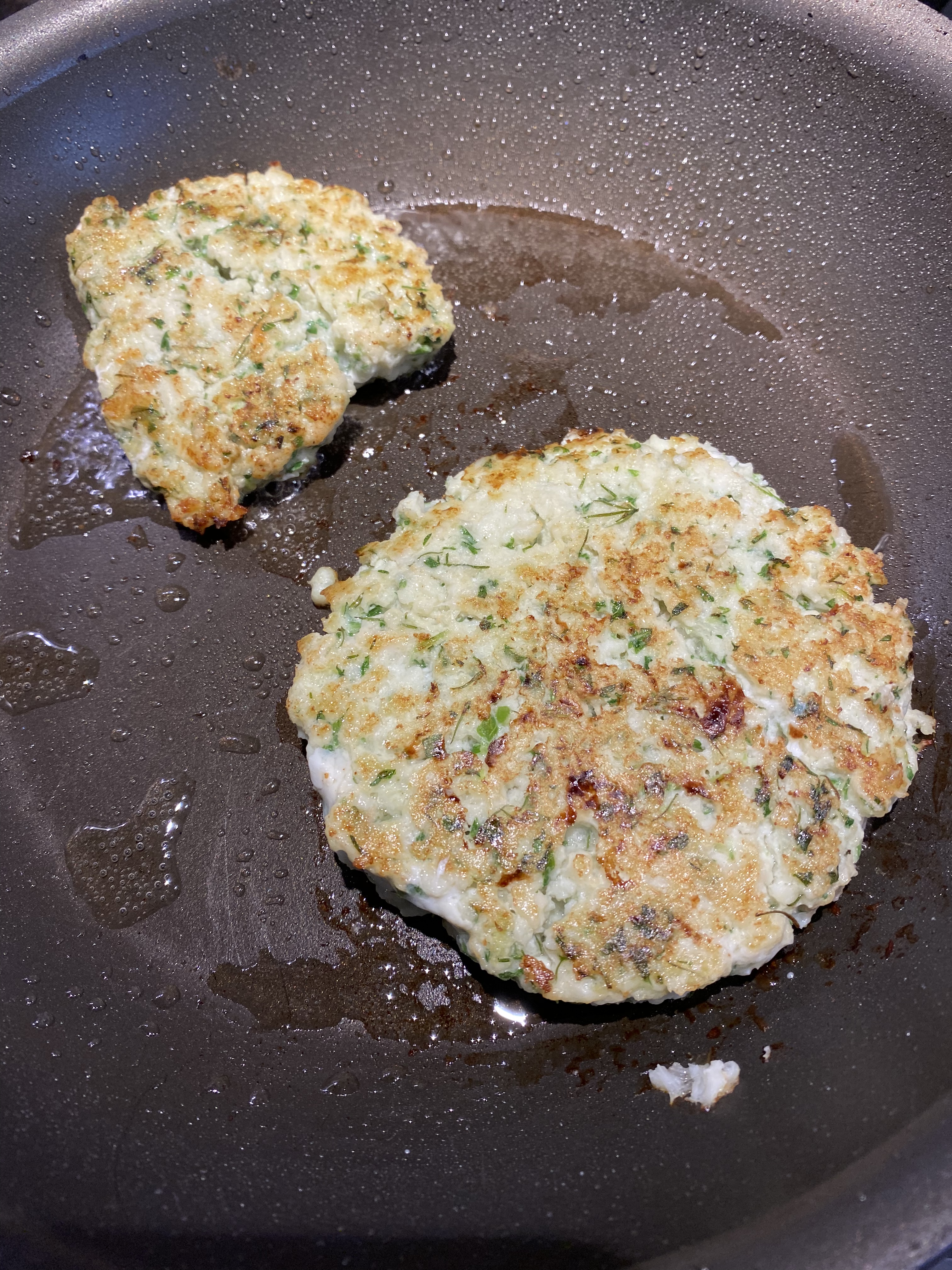 Biffarna gjorde på lax var väldigt goda de med. Lättare att steka eftersom lax är en fetare och torrare fisk och biffarna hölls ihop bättre.