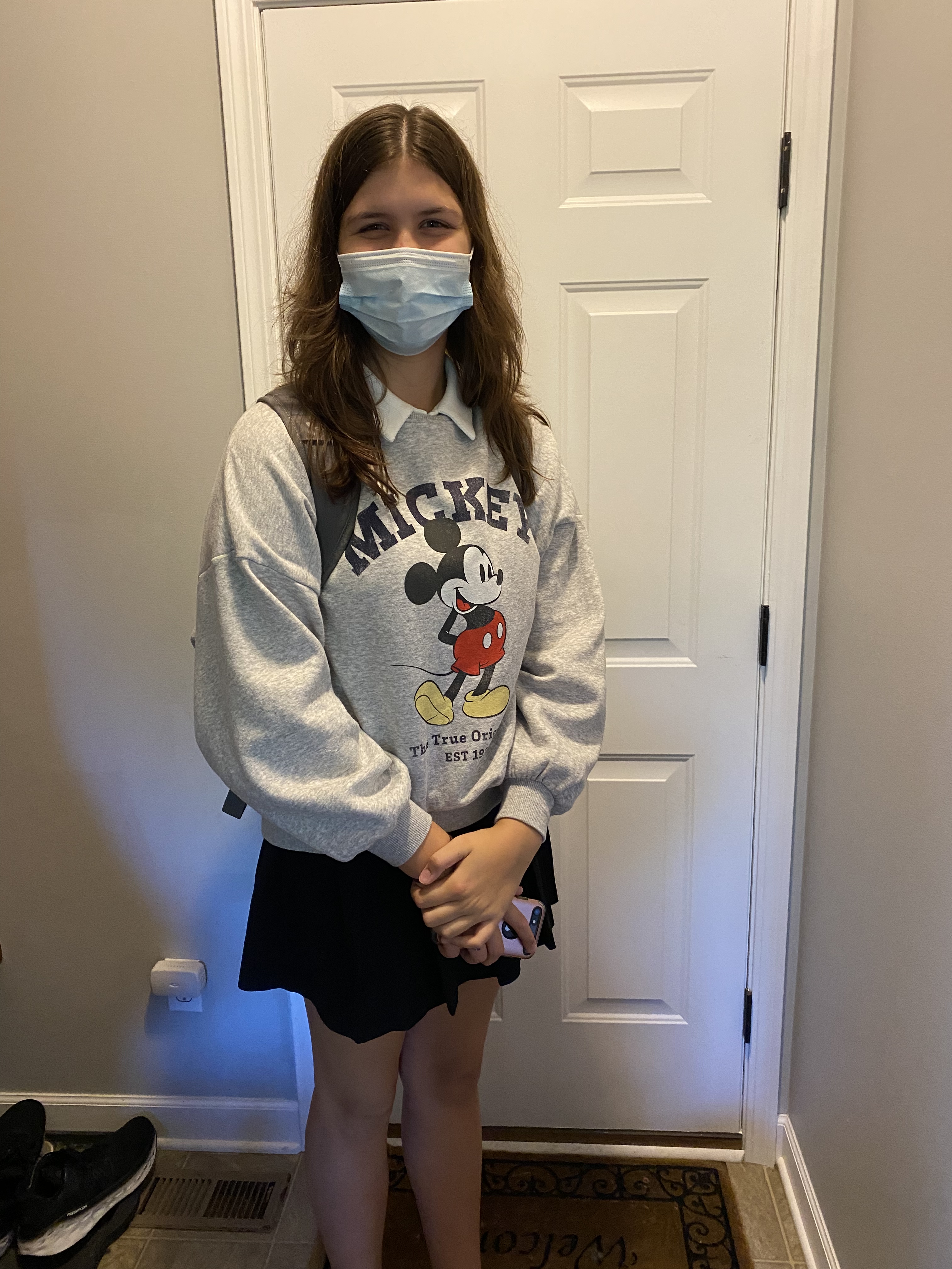 Lillasyster på väg ut till skolbussen. Åk.8.