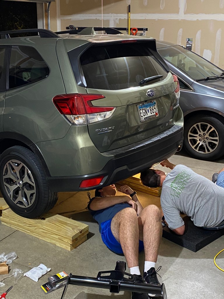 Det jobbades hårt ute i garaget på torsdagskvällen. En dragkrok installerades på nya bilen och pojkarna höll på nästan inpå småtimmarna innan det hela var klart. Nåja, inte riktigt, men kl.23 på en skol-och jobbkväll räckte gott och väl. Detta projekt krävde ett nytt borrbett och två olika färder till två olika byggaffärer innan rätt borrbett hittades. Projektet blev klart i alla fall och nu stoltserar Subarun, som lystrar till det italiensk-spanskklingande namnet Adolfo, med en dragkrok!