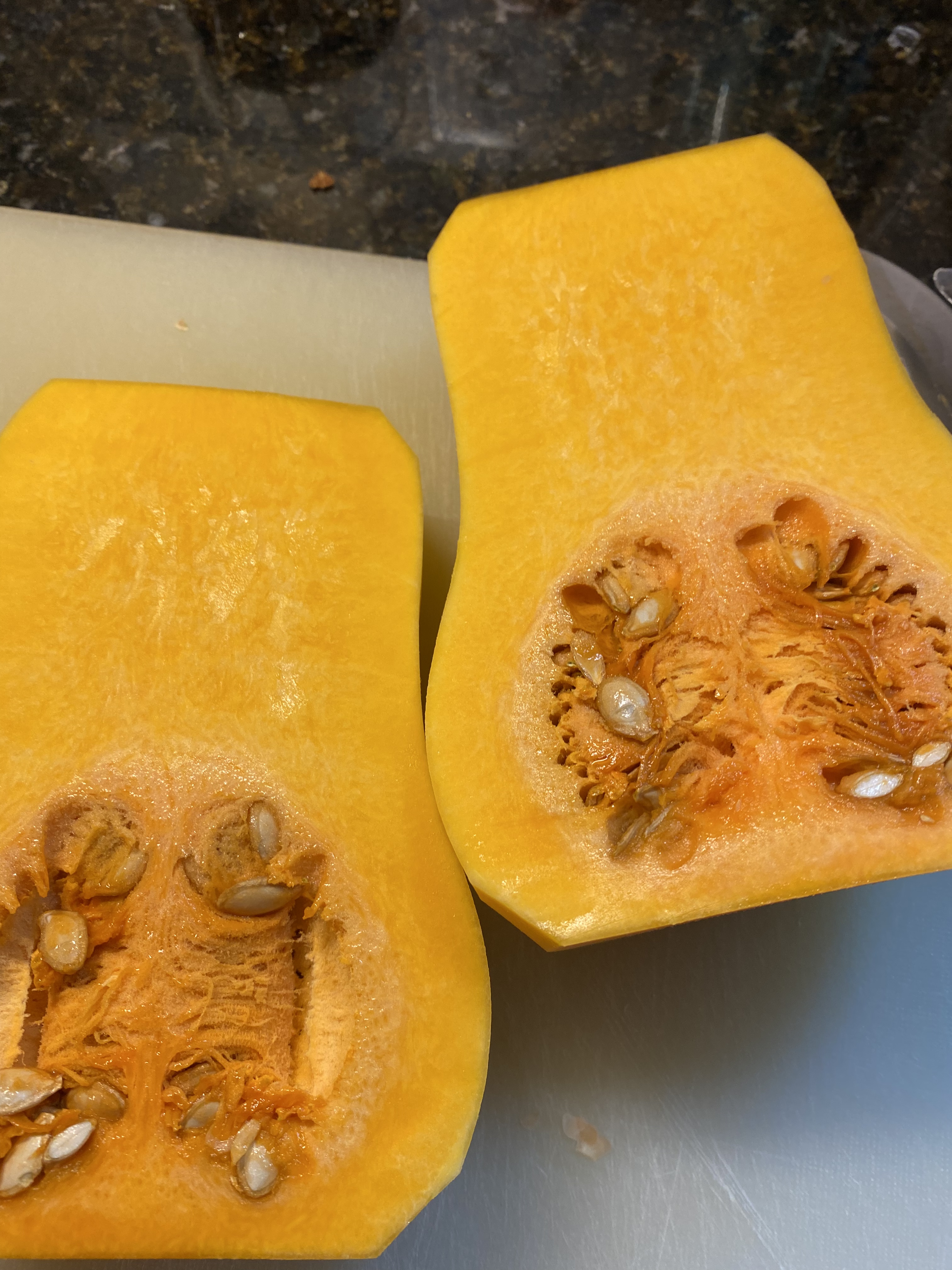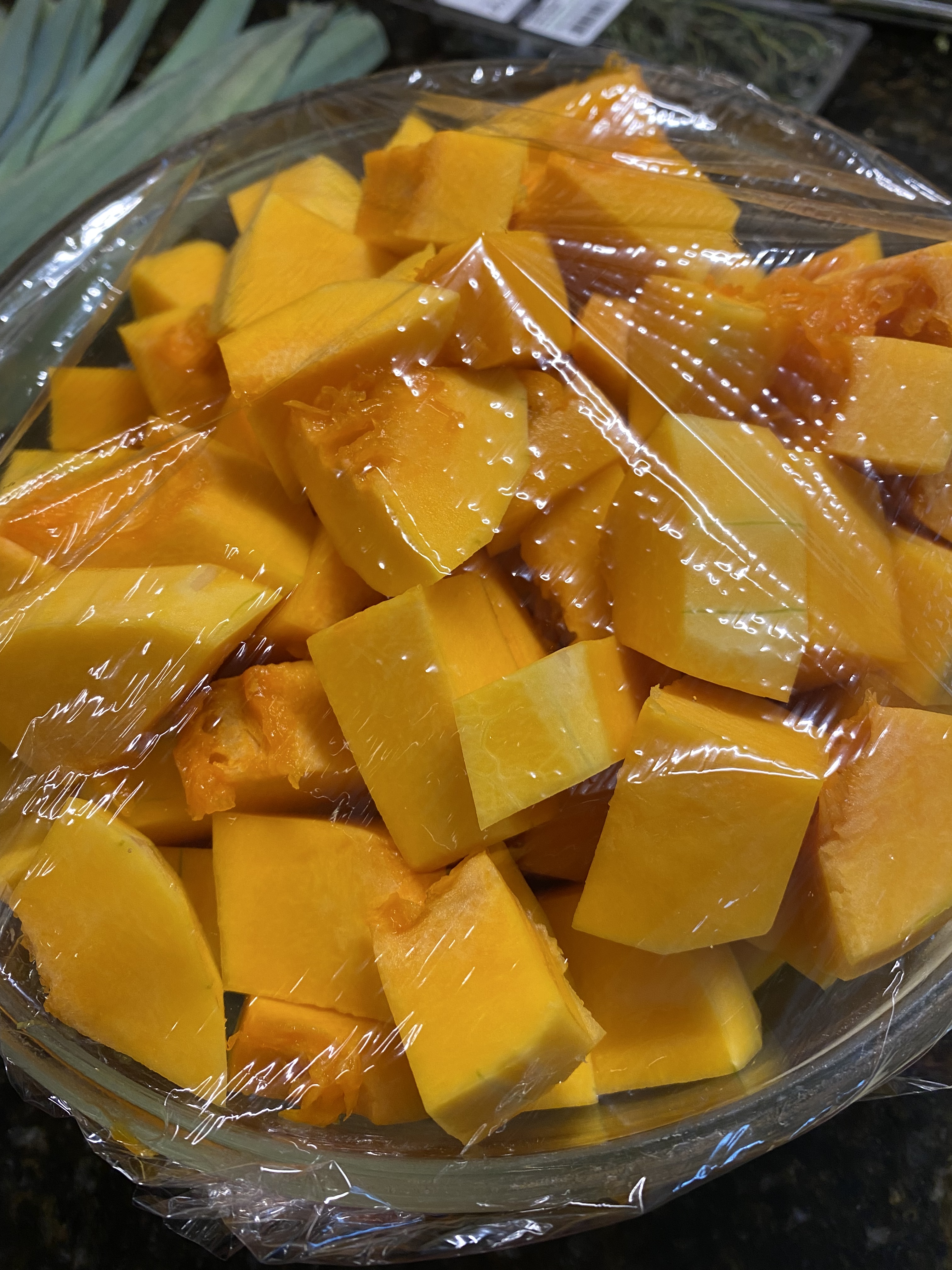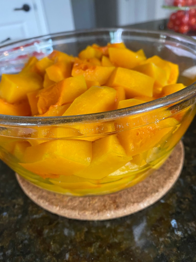 Jag gröpte ur kärnorna, skar pumporna i bitar och satte bitarna i en stor skål som jag sedan täckte med färsk/plastfolie.