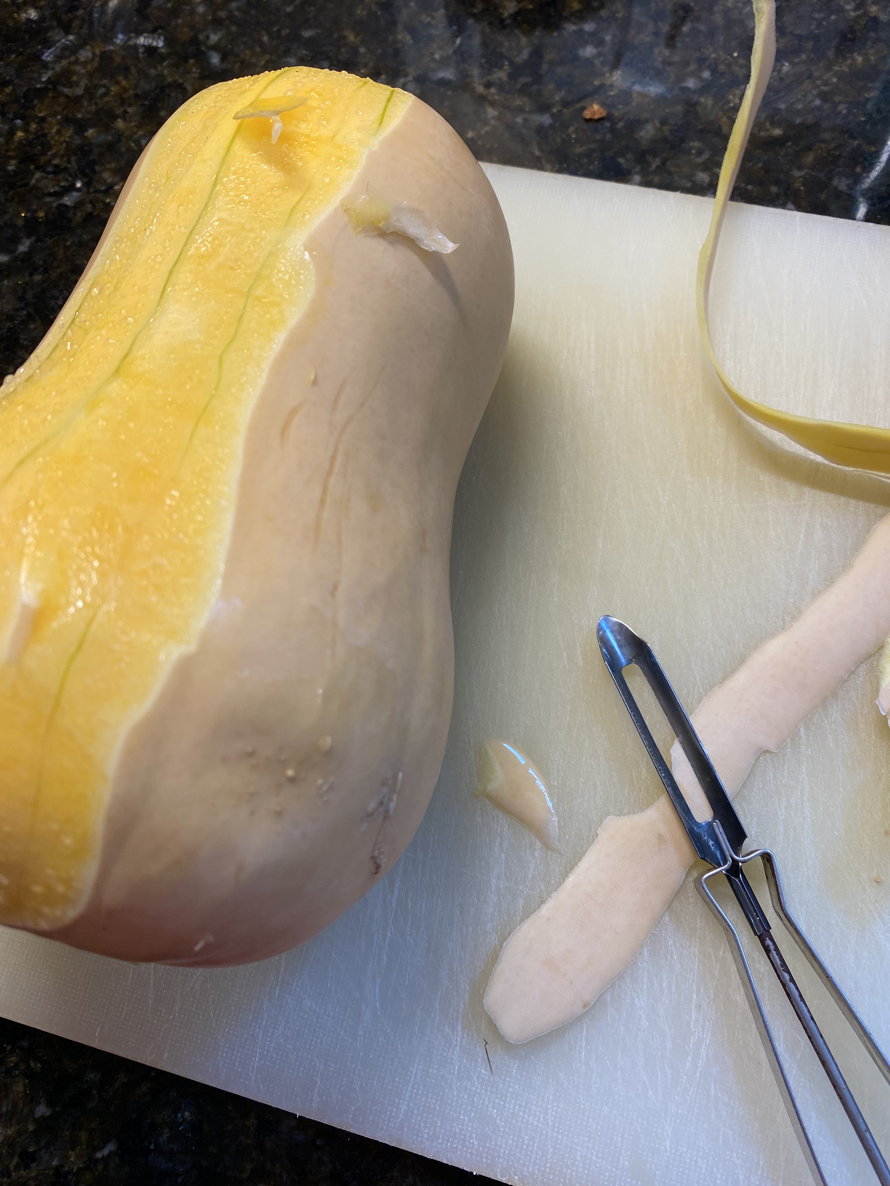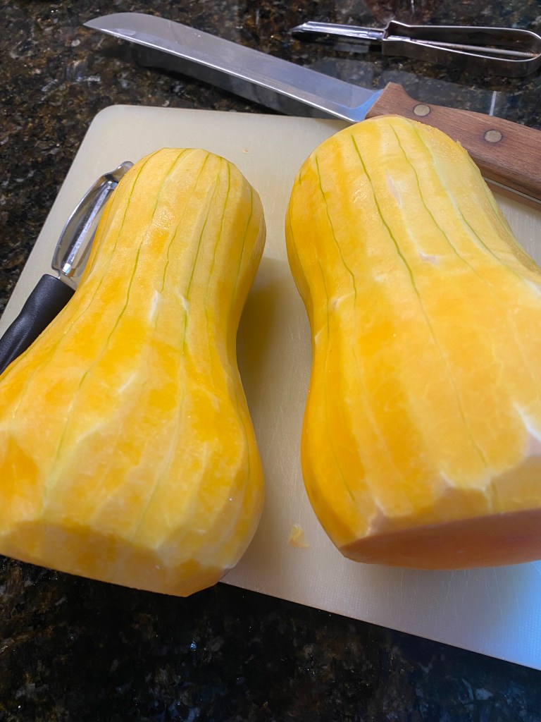 Myskpumpa ( cucurbita moschata) eller butternut squash som den heter här i USA, är förvånsvärt lätt att skala med en helt vanlig potatisskalare