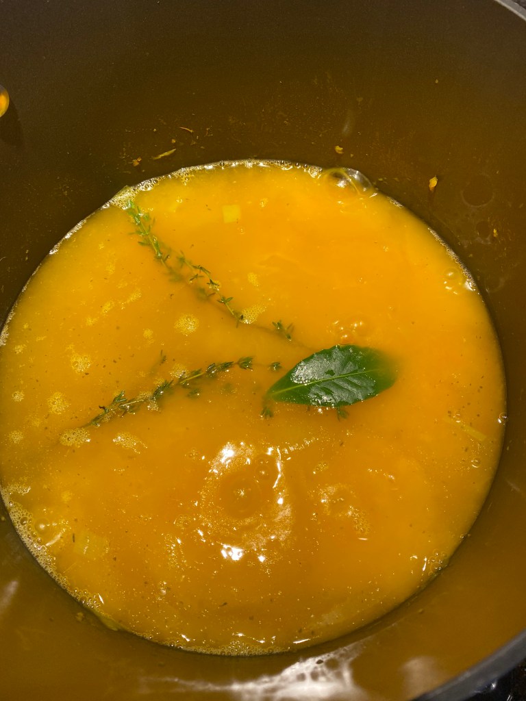 Sätt till en liter buljong, saften från pumpan som blev över från dräneringen, färsk timjan, lagerblad och övriga kryddor. Låt soppan koka i 10 minuter. Rör om då och då.