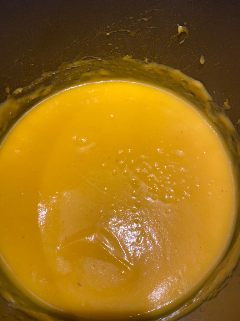Den färdiga soppan gjord på myskpumpa (butternut squash soup)