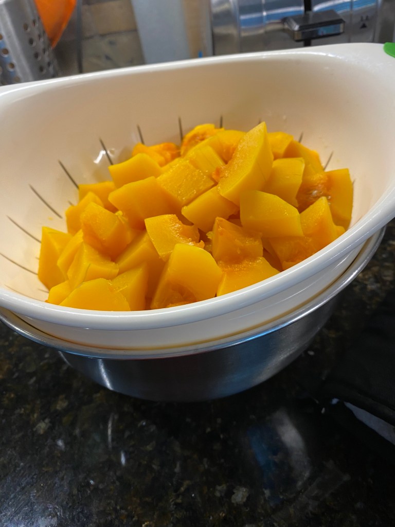 Från bilden ovan ses hur jag skalade myskpumpan. Den är hård på utsidan före den är kokt, så den var relativt lätt att skala. En och en halv liter skuren pumpa rekommenderades i receptet och det visade sig att två mellanstora var rätt mängd.