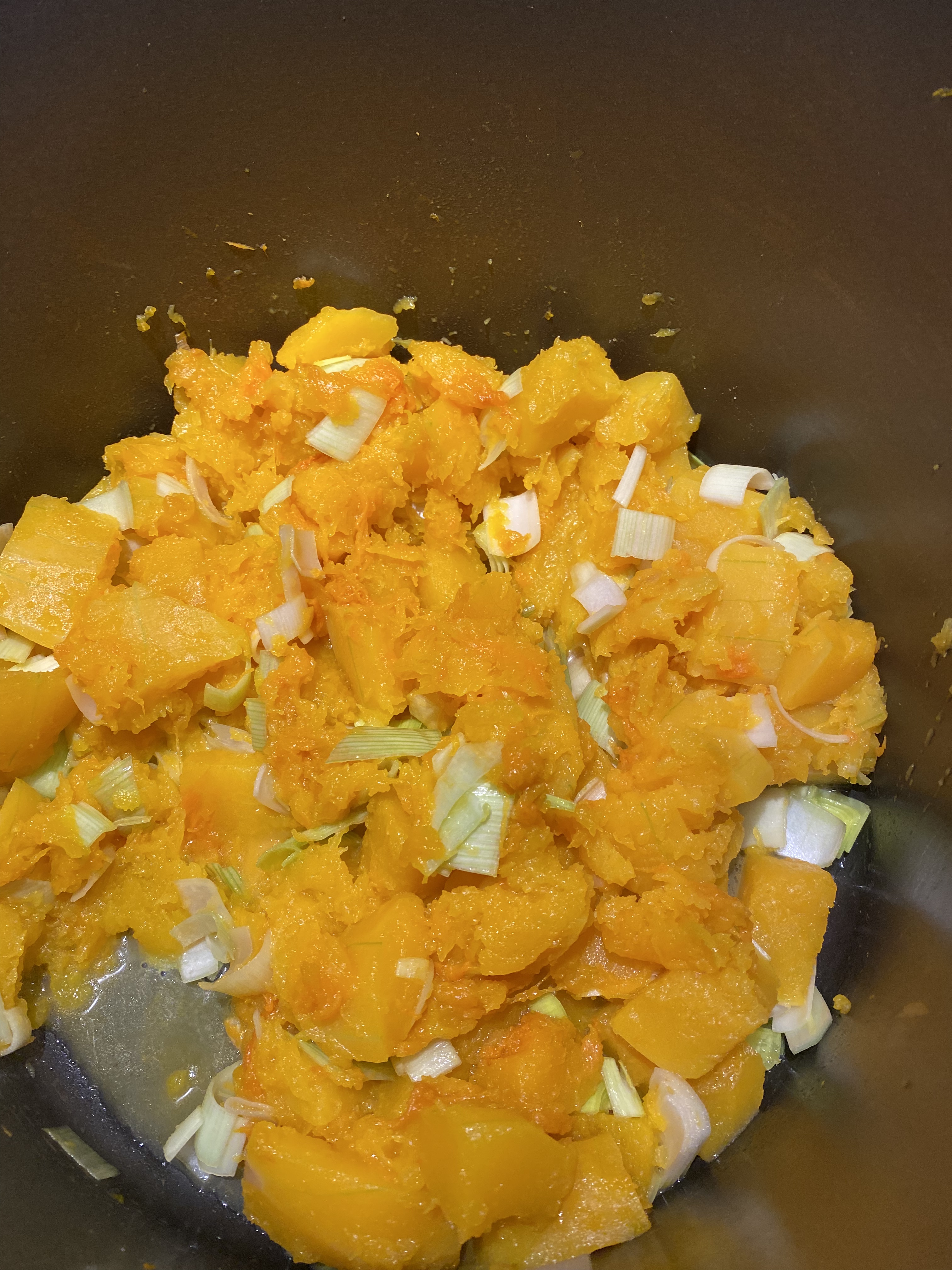 Här steks pumpan och purjolöken i smör