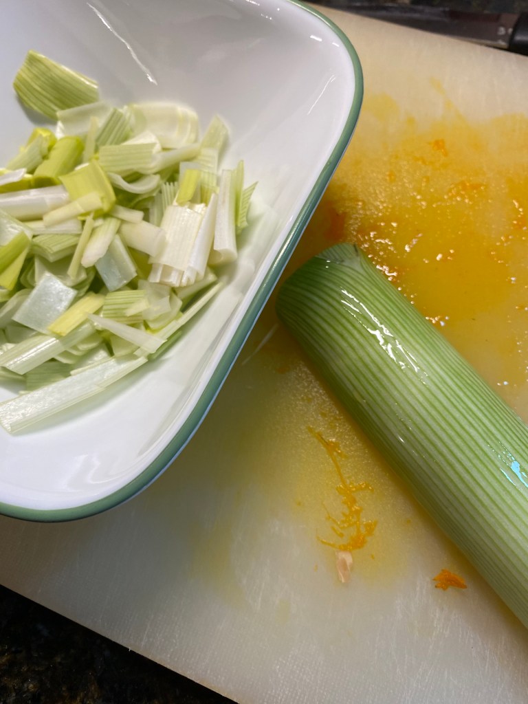 Medan vätskan rinner av pumpan skärs en purjolök. Endast de vita och ljusgröna delarna av purjolöken skärs smått.
