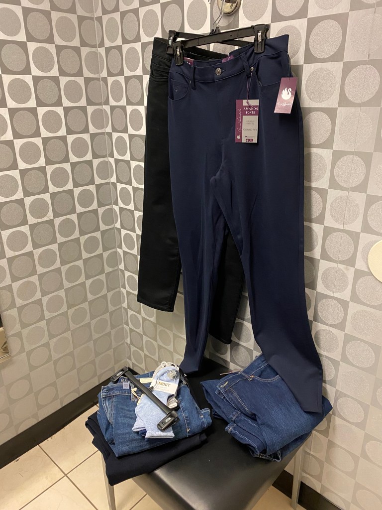 Jag beslöt mig för att ta god tid på mig och riktigt söka länge och väl. Hittade flera par byxor som jag ville prova. Behövde både jeans och lite snyggare byxor. Hade till slut 7 stycken par som jag ville prova och gick till provhytten. Som var stängd!