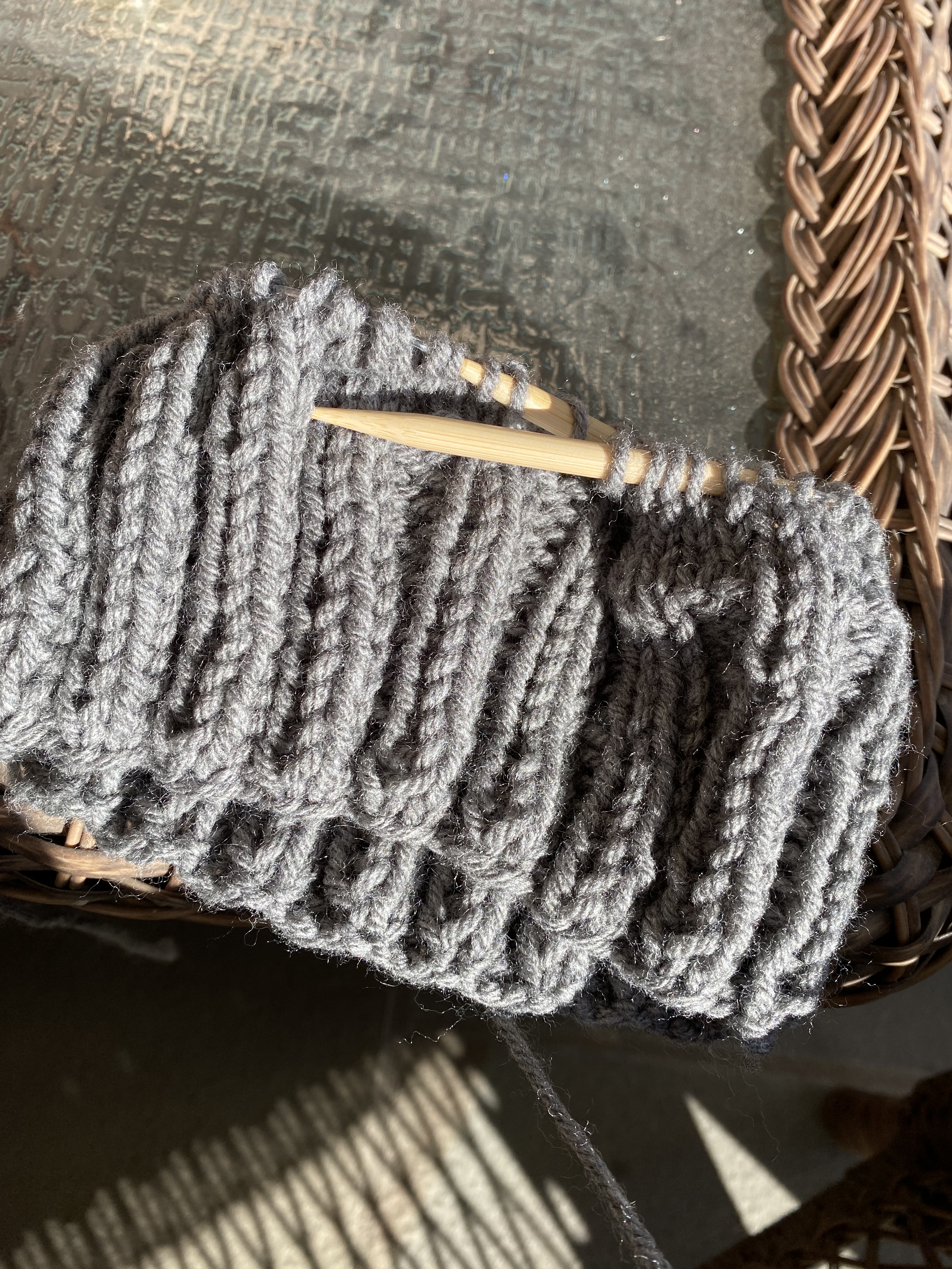 Sagt och gjort. Vid besöket hos henne förra helgen gav hon mig garn, mönster och även stickor. Jag tog däremot inte emot stickorna. Tyckte det var lika bra att köpa mina egna. Efter tre besök i lika många hobbyaffärer hittade jag äntligen de två olika storlekar rundstickor som krävdes och satte igång på tisdagskvällen….. och det blev helt fel! Fick riva upp och ville inte att det fina garnet skulle förstöras. Sökte i min korg efter rester och hittade detta fina, gråa garn på bilden ovan. Satte upp maskorna på mina nya rundstickor åter, räknande som en tok och lyckades!
