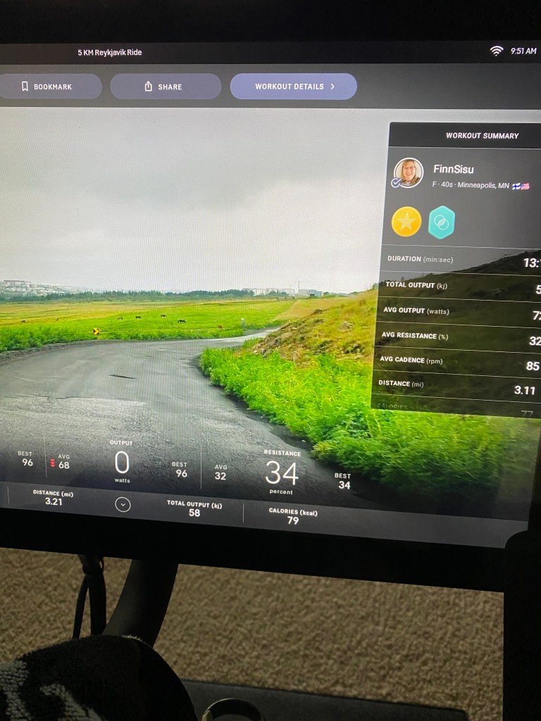Efter mitt första cykelpass via livesändning imorse kl.9 klickade jag mig vidare till denna cykeltur ovan på Island. Det erbjöds två olika pass på Island. Ett på 30 minuter och ett på 5 km. Eftersom jag just hade kämpat mig igenom ett träningspass valde jag cykelturen på 5 km. Och ångrade mig inte!