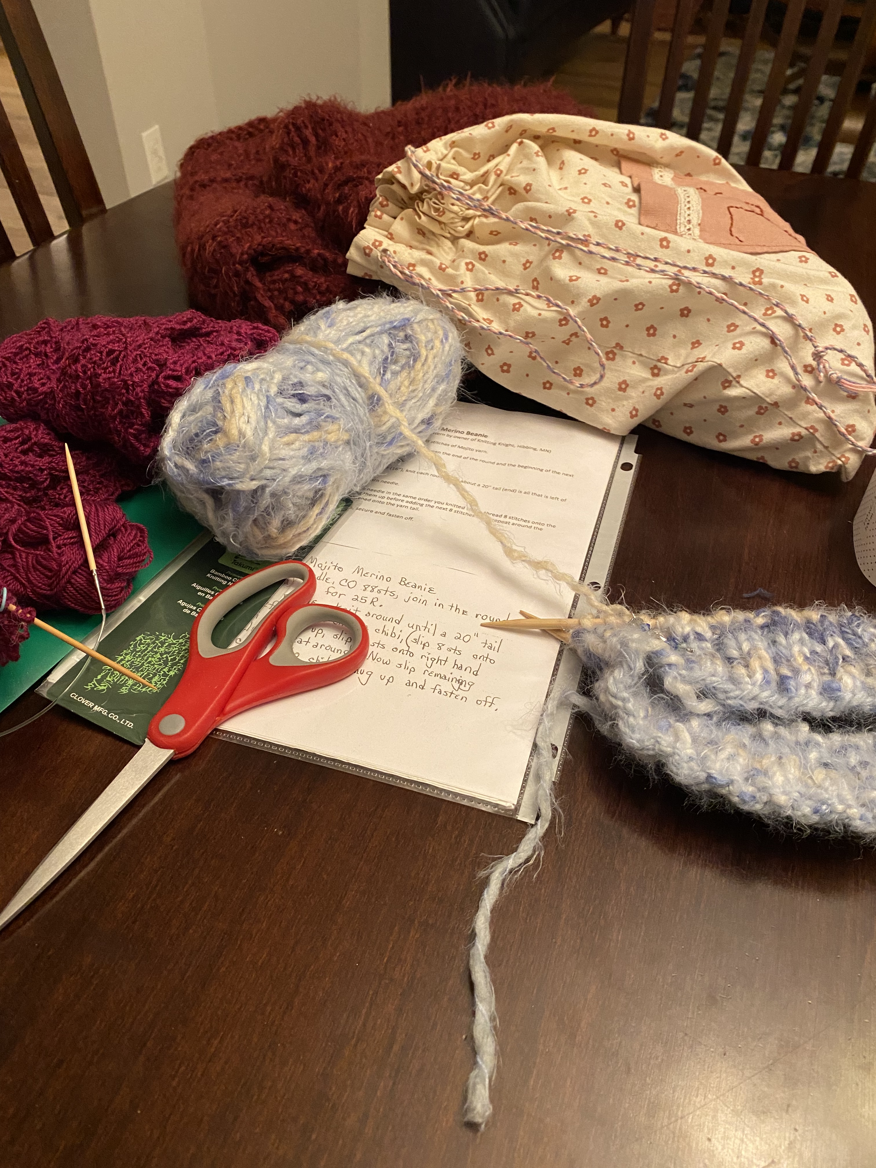 Som vanligt blev det två trevliga timmar framför skärmen med allehanda diskussioner och lika många olika projekt. Jag gav mig åter i kast med en ny mössa och fick en hel del klart på den. Ribbstickningen är klar och jag bytte still större stickor för att sticka resten av mössan. Den syns till höger i bilden i förgrunden, innan ribbstickningen på mössan var klar. Spetsen har fått ta en paus i några dagar och en halsduk blev också klar med de sista löshängande garnändarna insydda.