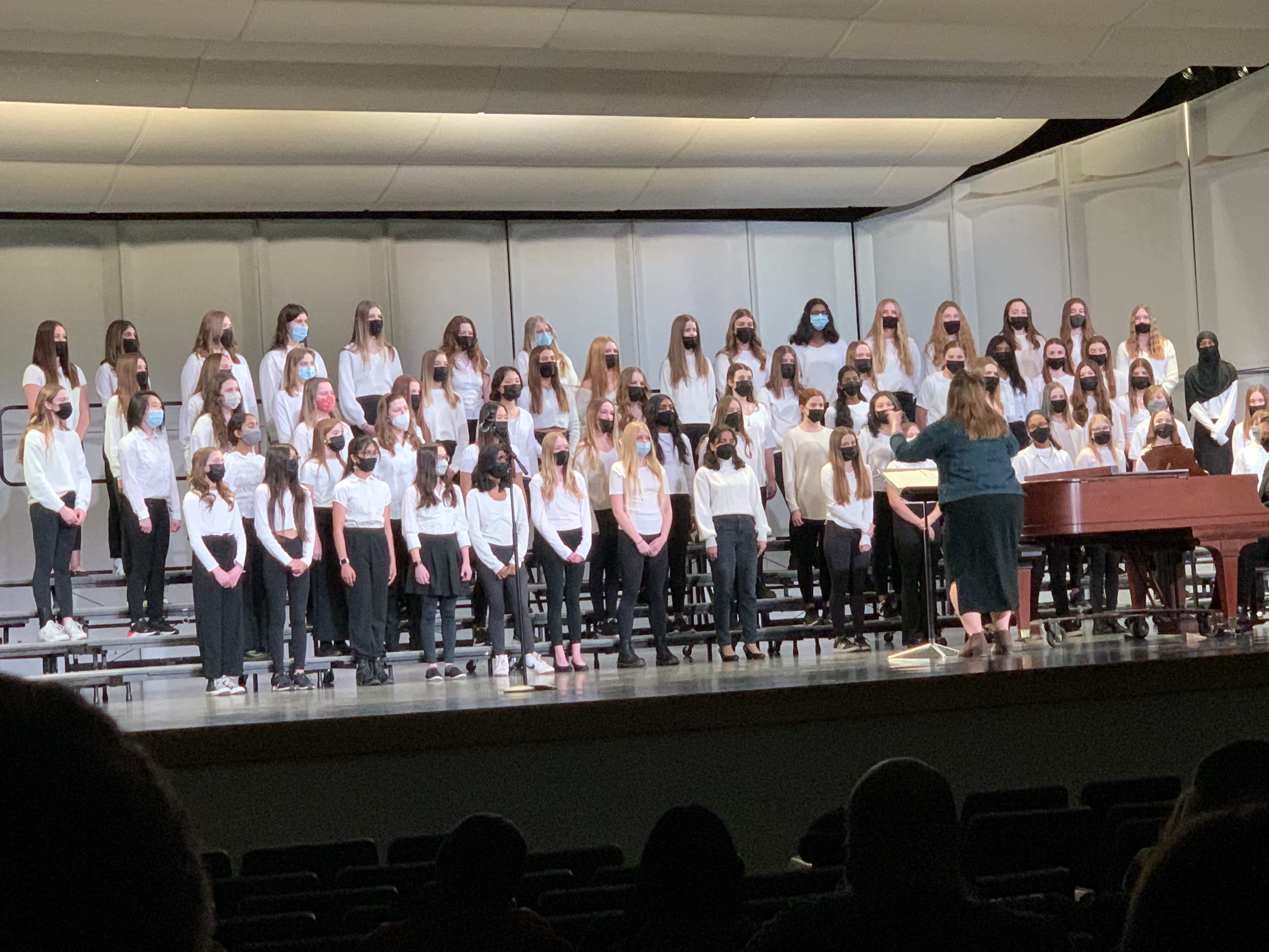 Eftersom årskurs 8 har en hel del elever och kören är stor, hade musiklärarna delat in körkvällen i två körer. Sopranerna och alterna uppträdde i den första kören och tenorerna och baserna i den andra. Detta gjorde ju förstås att publiken bestående av föräldrar och en och annan far och morförälder, var mycket mindre och rymdes, med distans i skolans rätt stora auditorium . Krav på munskydd naturligtvis och så satt vi då där uppradade och redo att lyssna på eleverna.