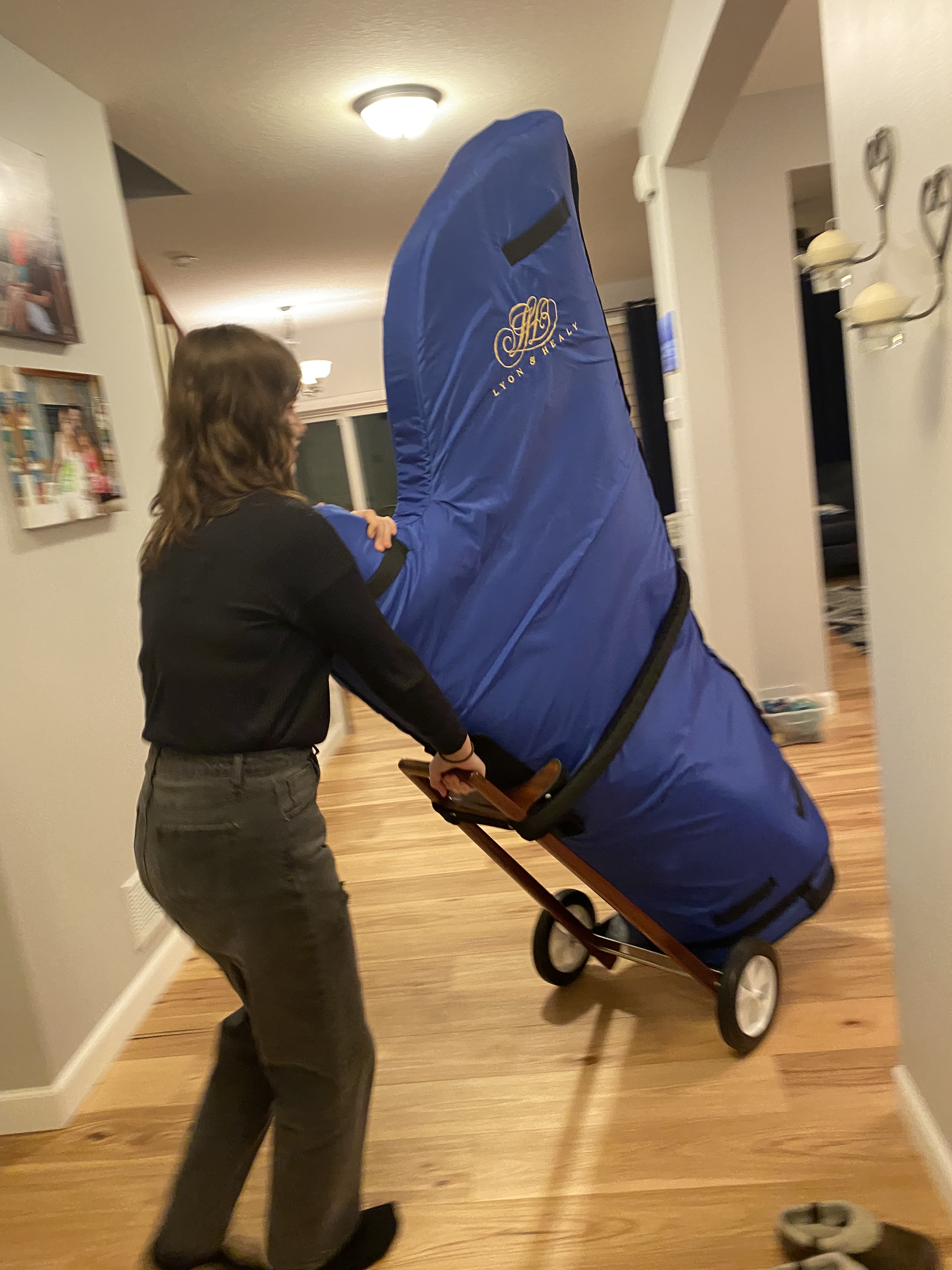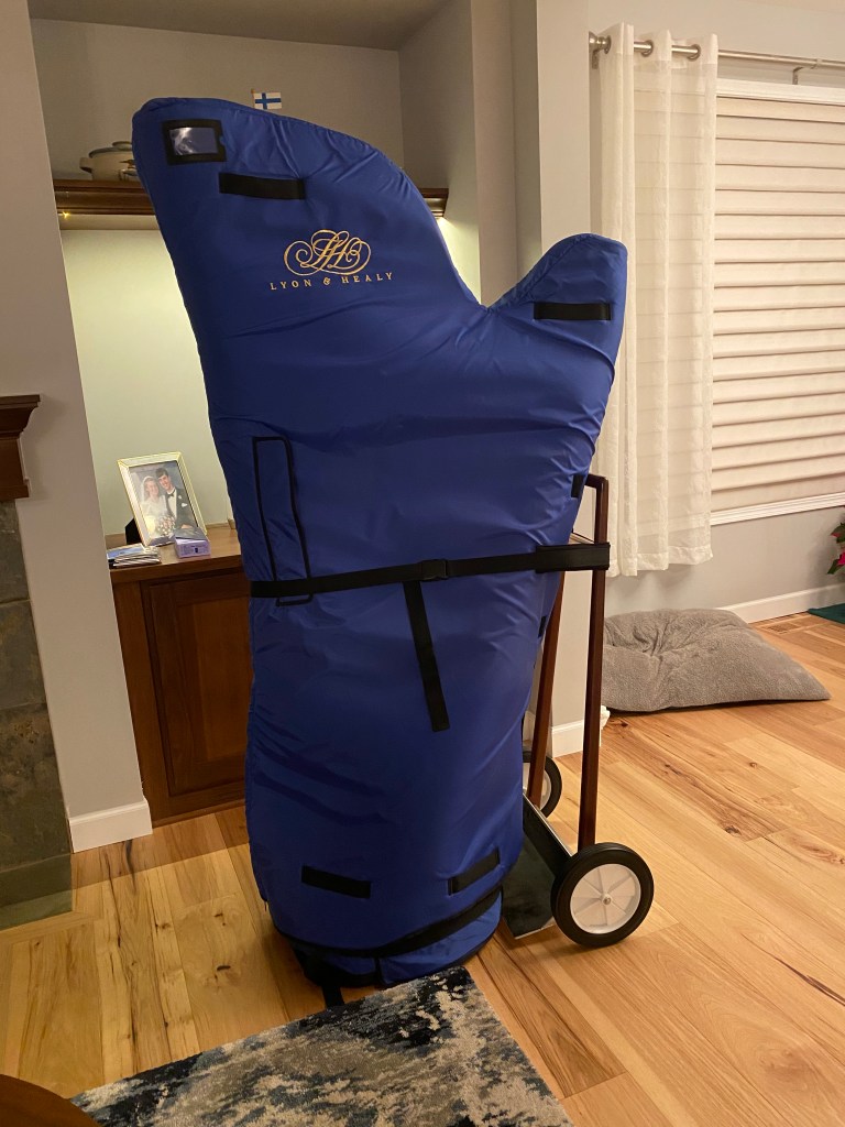 Detta jätte instrument flyttade in hos oss våren 2020. I maj närmare bestämt. När allt hade så småningom lite börjat öppna upp igen, så kom en harpa mer eller mindre med posten. Levererad direkt från fabriken i storstaden Chicago i delstaten Illinois. ( ni vet väl förresten att det sista s:et i Illinois inte skall uttalas? Bra! Tänkte väl det!) Eftersom vi inte kunde resa till fabriken som tidigare planerats under hösten, skickades harpan faktiskt hit till oss på prov! Lillasyster fick välja mellan två olika modeller. En kvinna spelade på de båda harporna vid fabriken. En i gången medan ngn filmade henne. Länken skickades till oss och vi gick in på Youtube och tittade och lyssnade. Den som vi ( främst Lillasyster) tyckte bättre om, skickades alltså hit till Tvillingstäderna för en månad på prov.