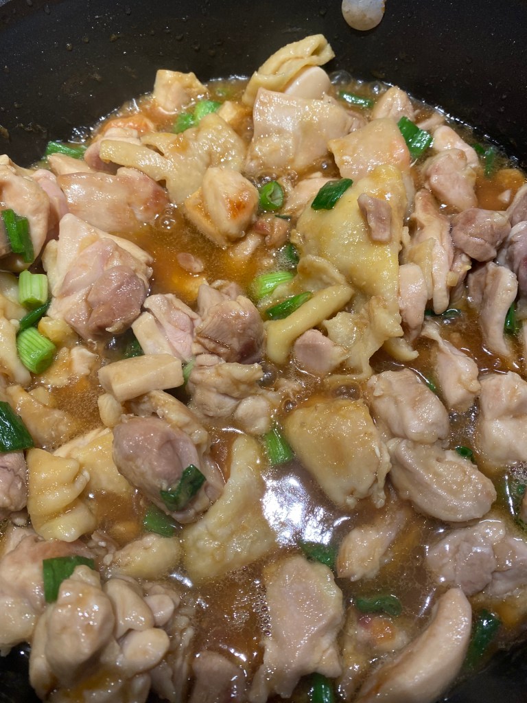 Steka bitar utav kycklinglår marinerade i risvin, sojasås, majsstärkelse ( eller potatismjöl), skuren ingefära, lite strösocker och salladslök.