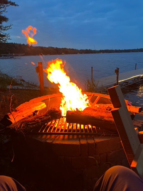 Ingen helg vid stugan är fullbordad utan en brasa. Alltså tände Maken en dylik sådan på söndag kväll. Vindarna hade lugnat ner sig, men gav i alla fall en tillräcklig fläkt vid vattnet att myggorna höll sig på avstånd.