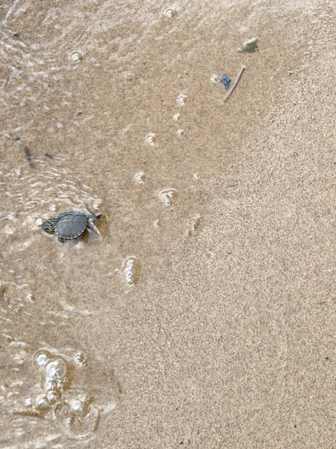 Pytteliten sköldpadda som Lillasyster hittade på vägen. till stugan. Tog upp och förde ner till sjön. Vågorna slog hårt mot stackaren och vem vet om den faktiskt klarade sig….?